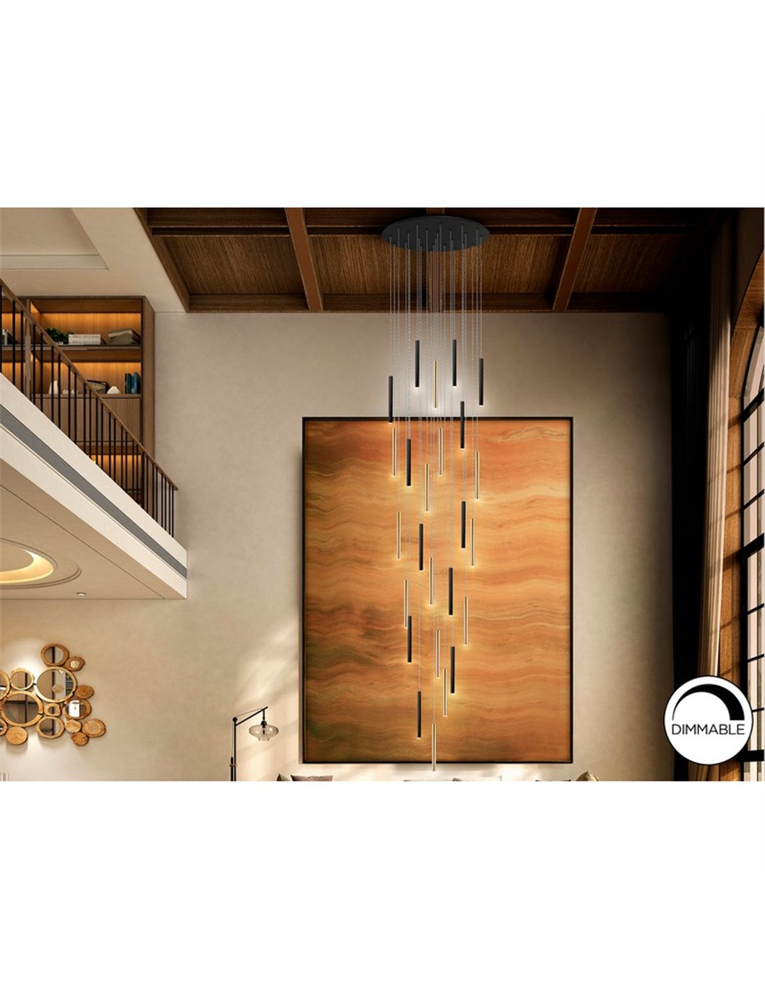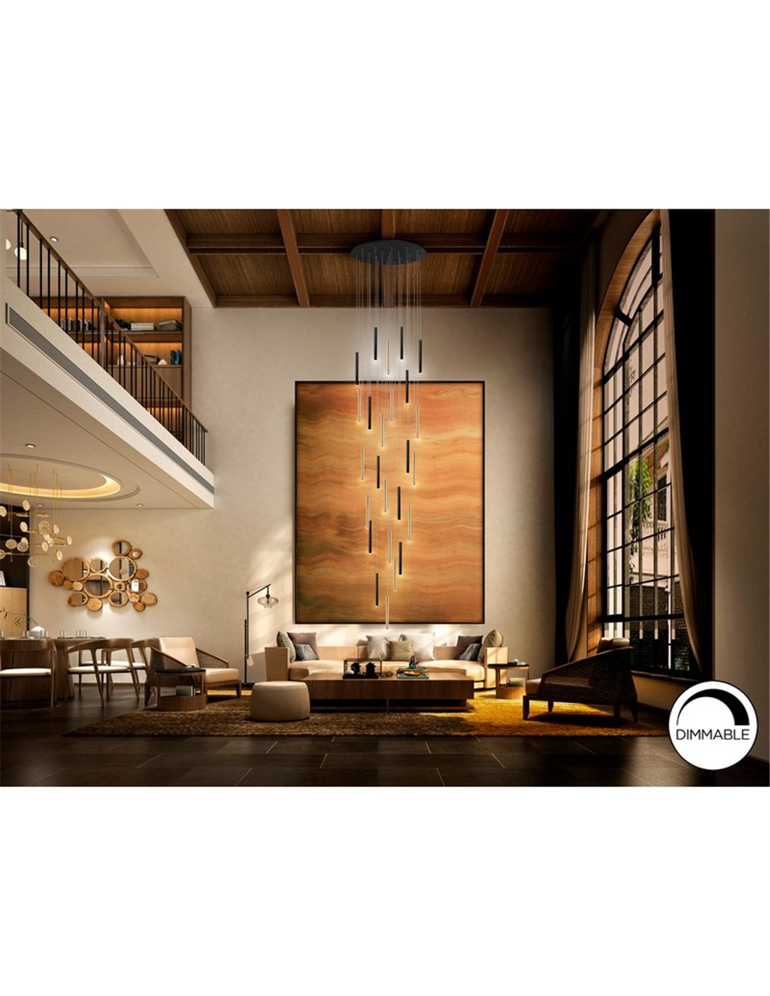 Die VARAS mit 25 Leuchten ist ideal für hohe Wohnzimmer, Treppen, offene Räume oder Vertragsprojekte, bei denen eine markante und dimmbare Lampe gesucht wird.