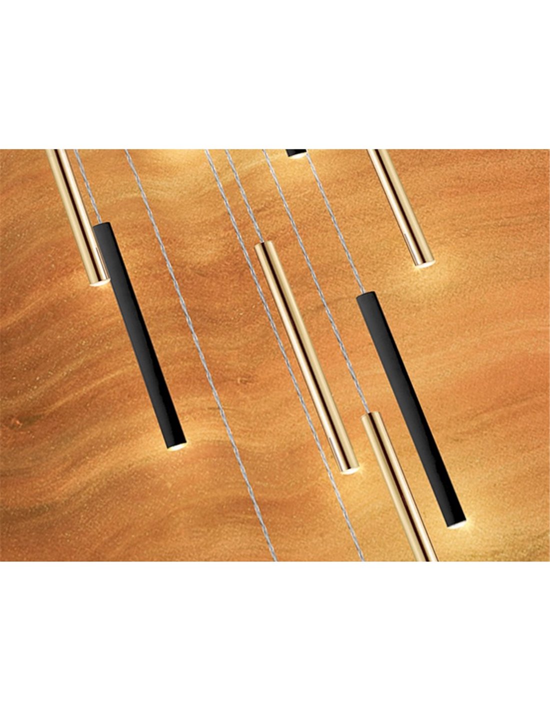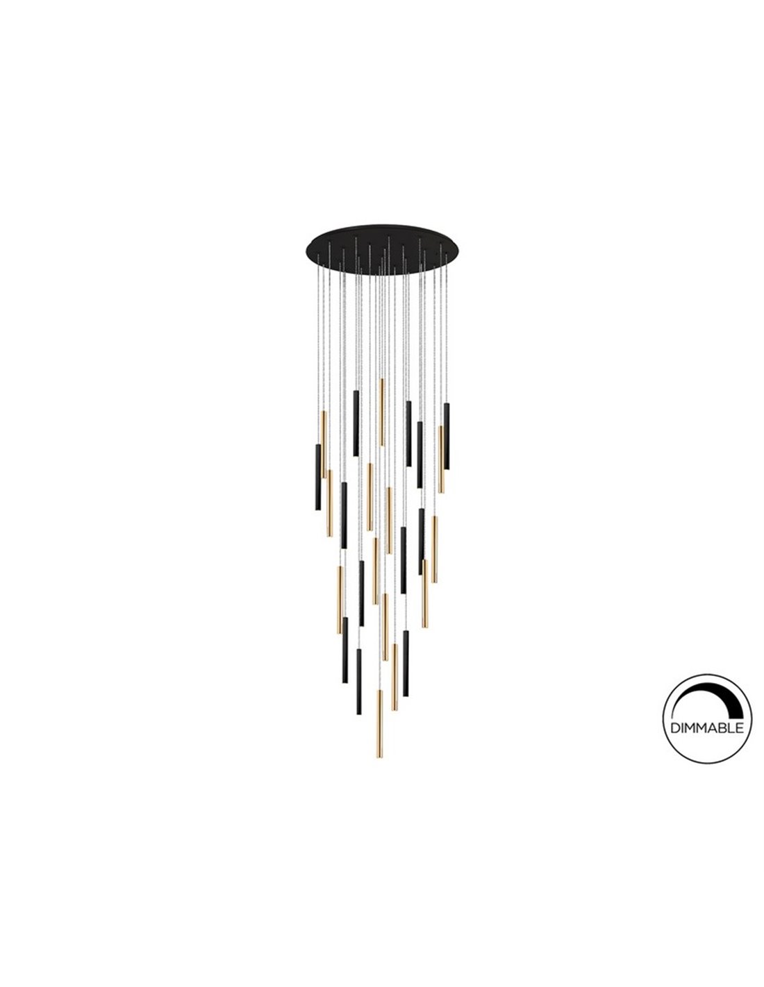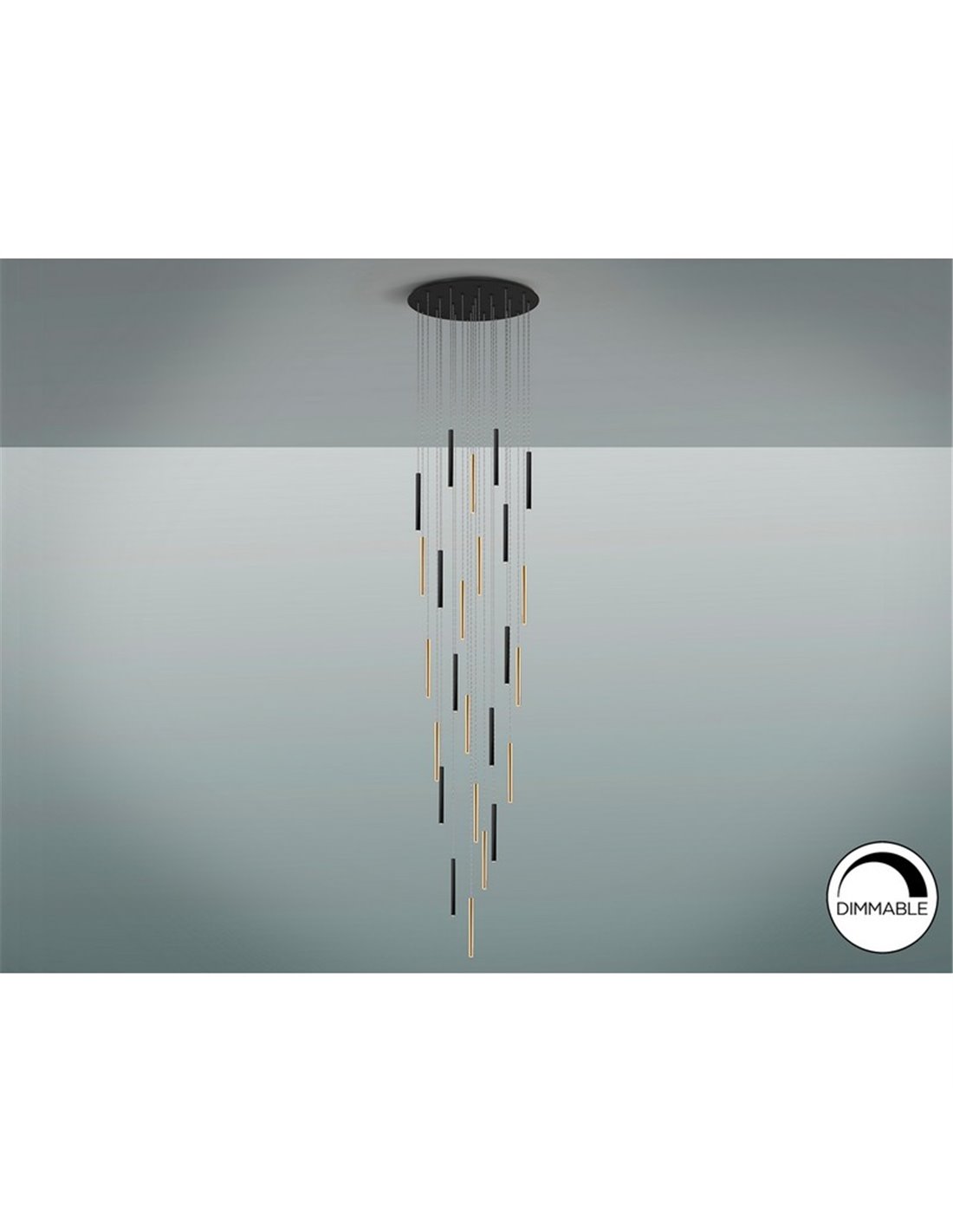 Die Deckenlampe VARAS mit 25 LED-Leuchten ist aus Metall mit Gold- und Matt-Schwarz-Oberfläche gefertigt und verfügt über opal-ähnlichen Acryl-Diffusor. Sie integriert 125W integriertes LED mit einer hohen Leistung von 11.250 lm und warmem Licht 3000K. Sie ist dimmbar und erlaubt eine maximale Installationshöhe von bis zu 500 cm.