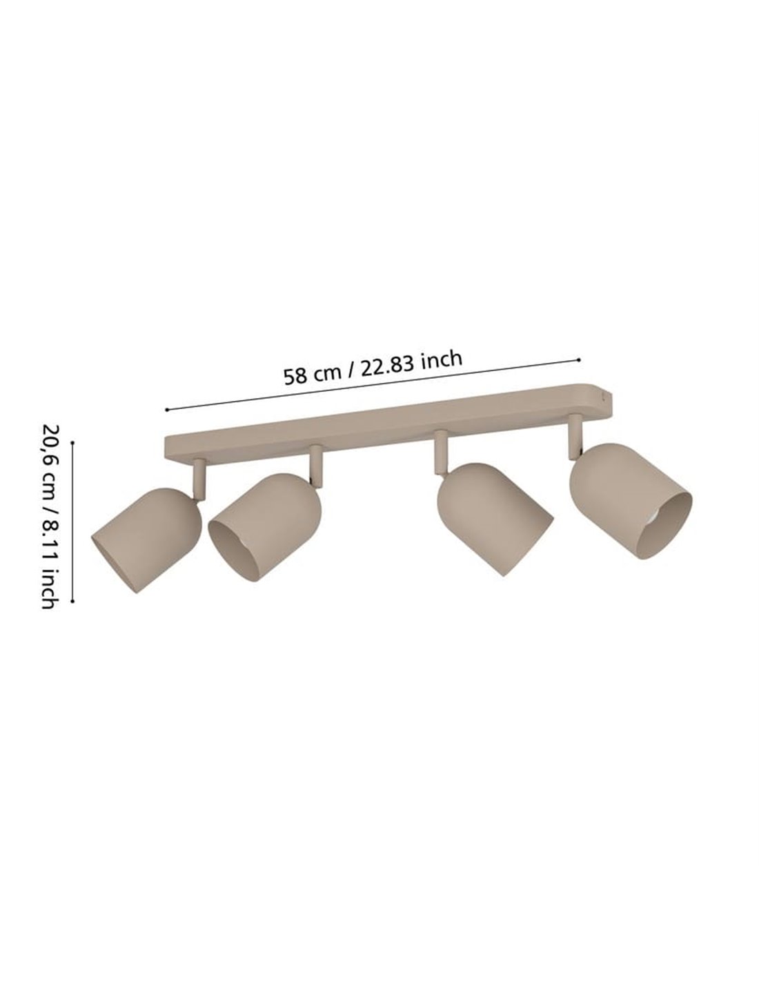 Die Deckenlampe TILSTON mit 4 Leuchten kombiniert minimalistisches Design mit sehr vielseitiger Funktionalität. Ihre vier zylindrischen Metallschirme in Sandfarbe sind gleichmäßig auf einem länglichen Sockel verteilt, was eine ausgewogene und gerichtete Beleuchtung ermöglicht.