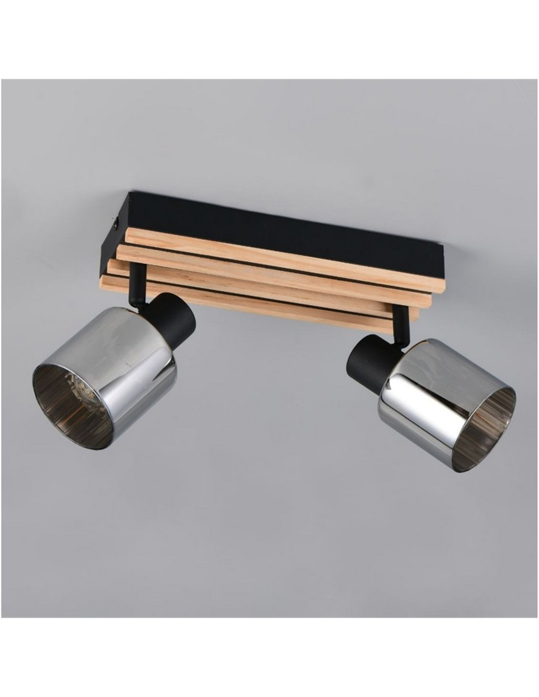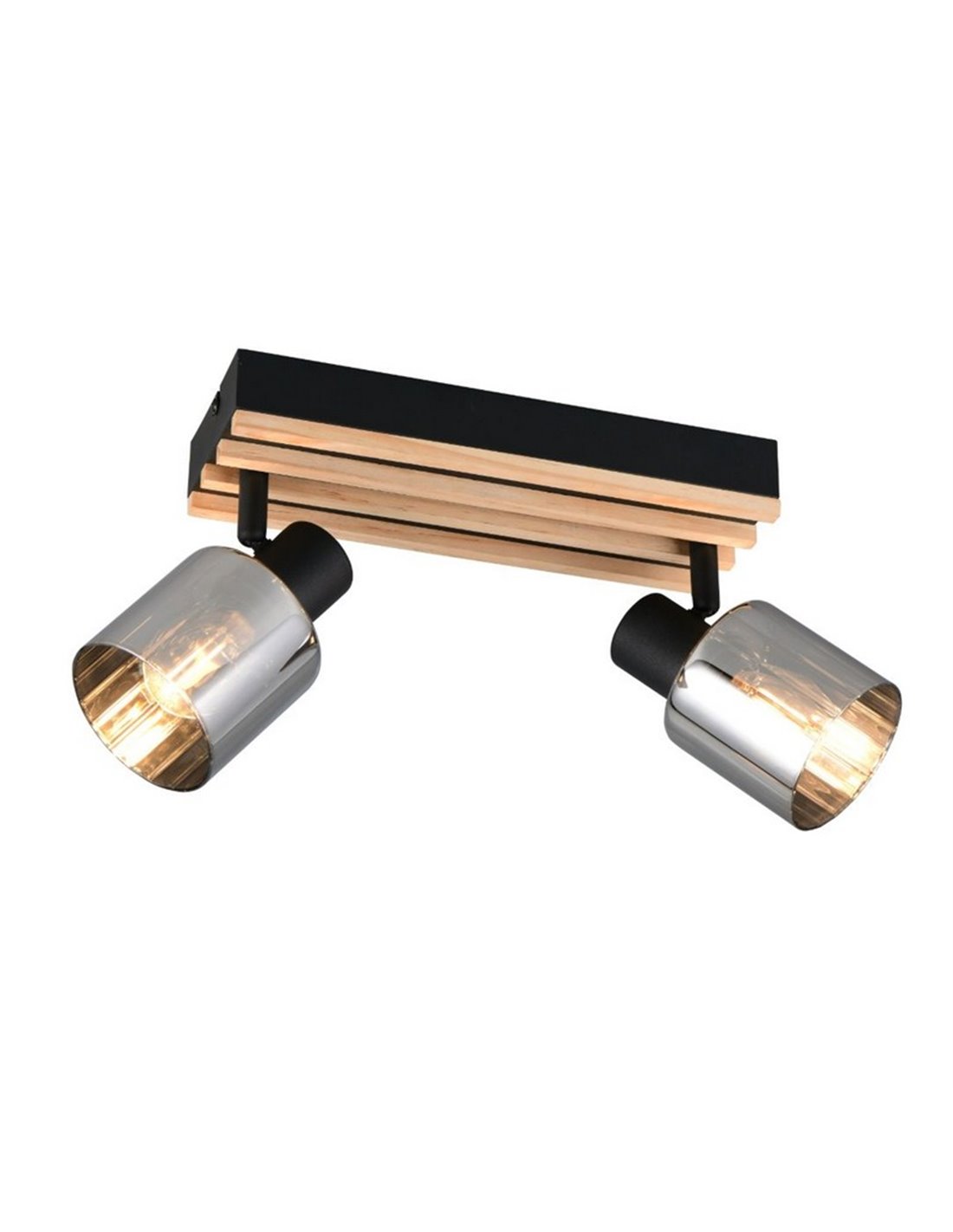 Die beiden Strahler lassen sich anpassen, um bestimmte Punkte auszuleuchten, ideal für Wohnzimmer, Flure, Küchen oder Arbeitsbereiche. Der Kontrast zwischen schwarzem Metall, Holz und rauchglas verleiht einen modernen und einladenden Touch.