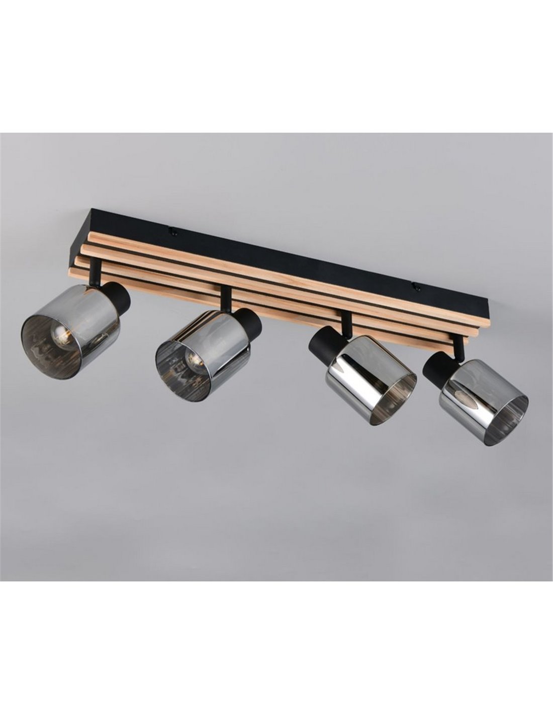 Die Deckenleuchte TRAVIA hat 4 schwenkbare Strahler in schwarzem Metall mit Schirmen aus rauchglas, die sanftes und dekoratives Licht abgeben. Sie funktioniert mit 4x E14 max. 40W (Glühbirnen nicht enthalten) und kann an Decke oder Wand montiert werden.