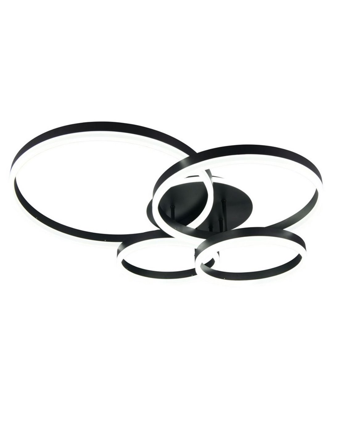 Die LED-Deckenleuchte DRAKE in mattem Schwarz-Finish vereint einen anspruchsvollen Stil mit hoher Lichtleistung. Ihre Struktur aus ineinander verschlungenen metallischen Kreisen von 80x70 cm bietet einen zeitgenössischen dekorativen Touch in jedem Raum, mit 50W Leistung und 5850 Lumen.