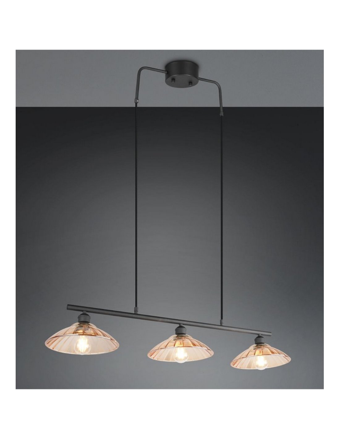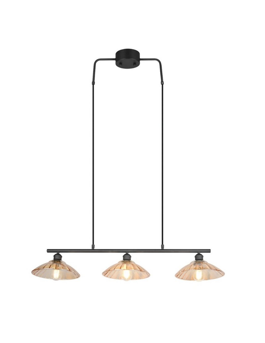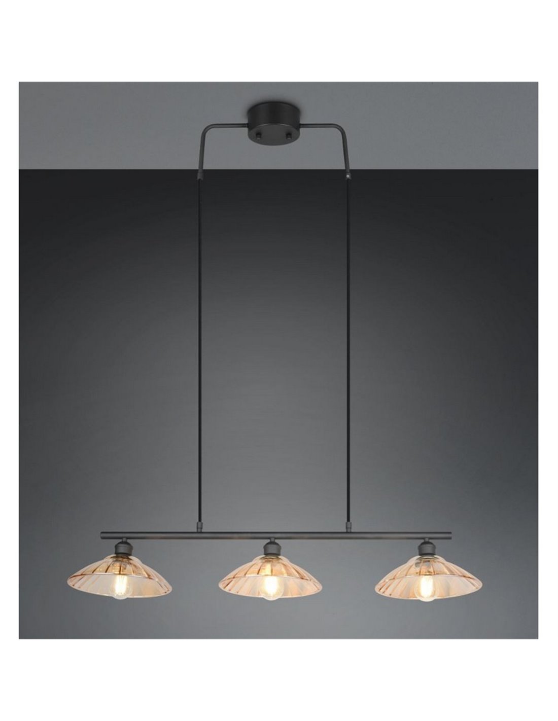 Die Hängeleuchte mit 3 Lichtpunkten kombiniert eine Struktur aus matt schwarzem Metall mit amberfarbenen Glasschirmen und bietet eine warme und dekorative Beleuchtung. Sie verfügt über eine höhenverstellbare und Hakenmontage. Sie funktioniert mit 3x E27 max. 60W (Glühbirnen nicht enthalten).