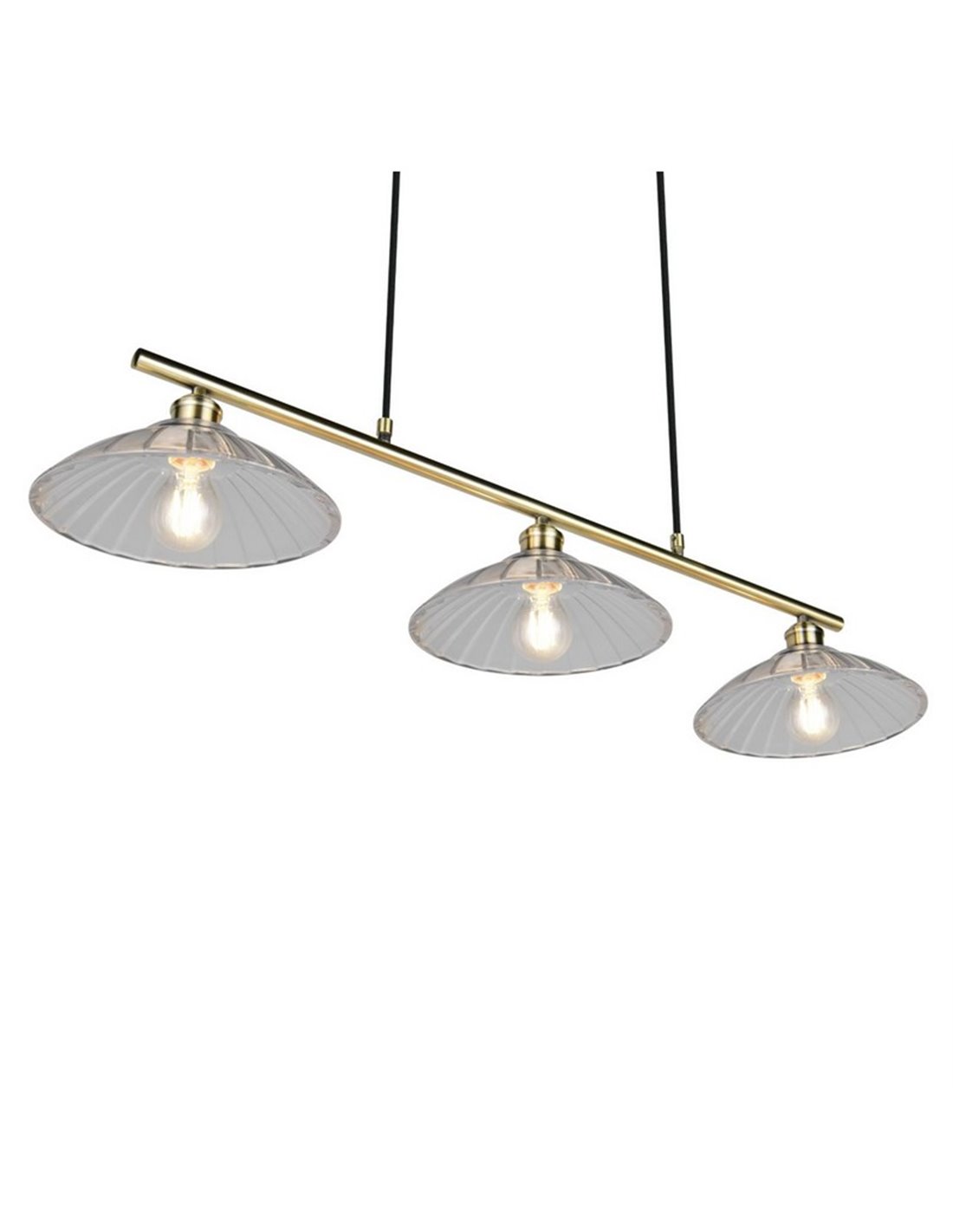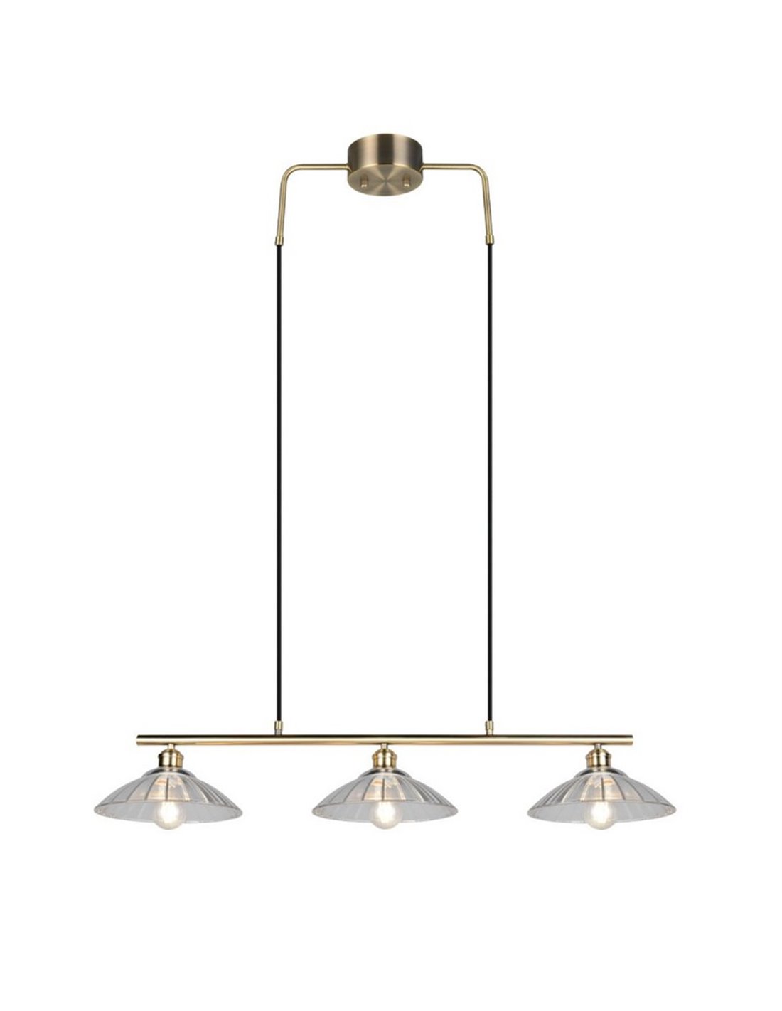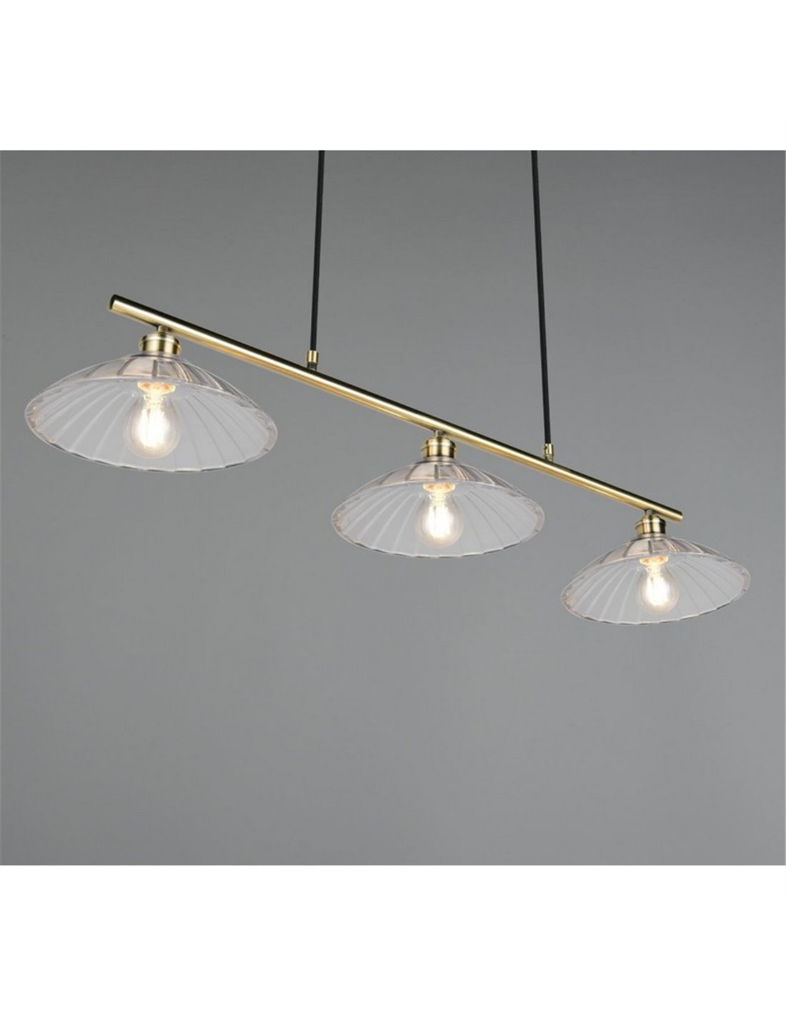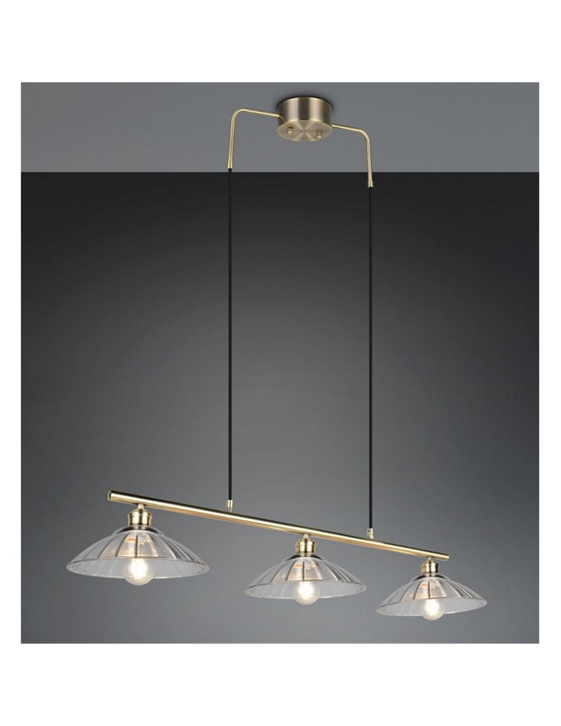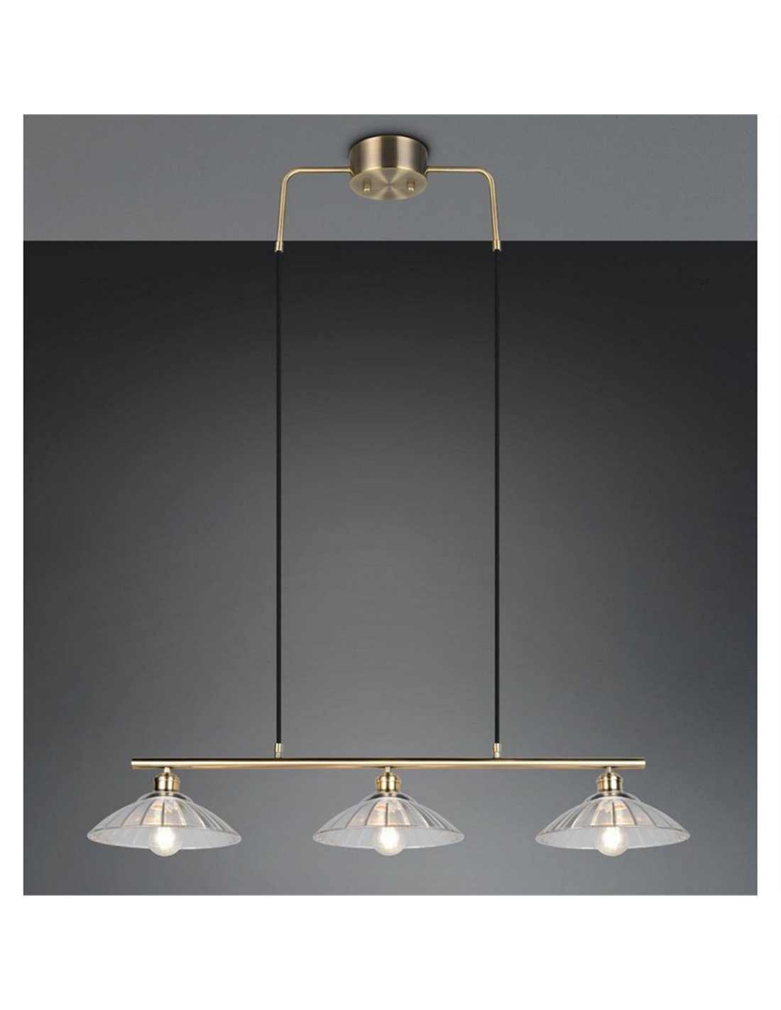 Die Deckenleuchte ELUNA hat 3 transparente Glasschirme und eine Struktur in Bronze-Finish und bietet eine klare und elegante Beleuchtung. Ihre höhenverstellbare Funktion ermöglicht es, sie leicht an den Raum anzupassen. Sie funktioniert mit 3x E27 max. 60W (Glühbirnen nicht enthalten).