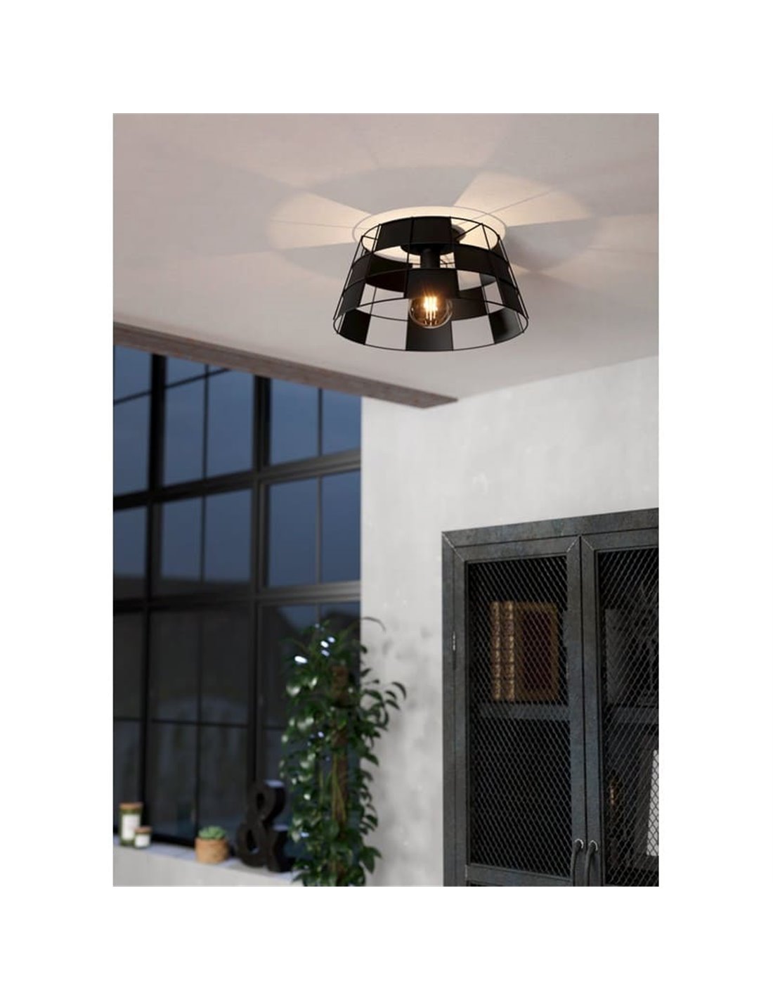 Industrielle Deckenleuchte PONTEFRACT von Eglo, mit Basis und Schirm aus schwarzem Metall im geometrischen Design, das Licht- und Schattenspiele erzeugt. Kompatibel mit E27-Glühbirne (nicht enthalten). Perfekt für industrielle und moderne Lebensräume.