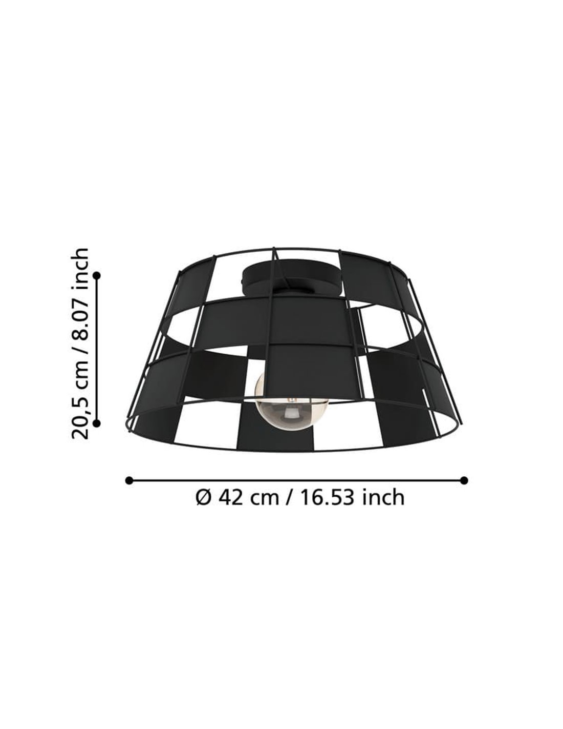 Die Deckenleuchte PONTEFRACT von Eglo kombiniert einen monochromen industriellen Stil mit einem geometrischen Design in ihrem schwarzen Metallschirm. Die quadratischen Öffnungen im Gehäuse erzeugen faszinierende Licht- und Schattenspiele, die jeden Raum in einen eleganten und modernen Raum verwandeln. Perfekt für Wohnzimmer, Esszimmer und Schlafzimmer, bietet diese Lampe eine atmosphärische Beleuchtung, die sich modernen und minimalistischen Dekorationen anpasst. Kompatibel mit E27-Glühbirnen (nicht enthalten), ideal für Filament-Glühbirnen, die ihr Design betonen.