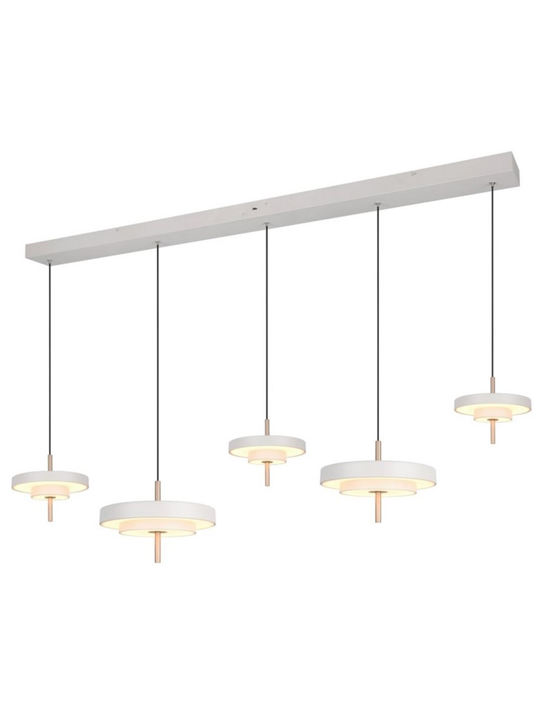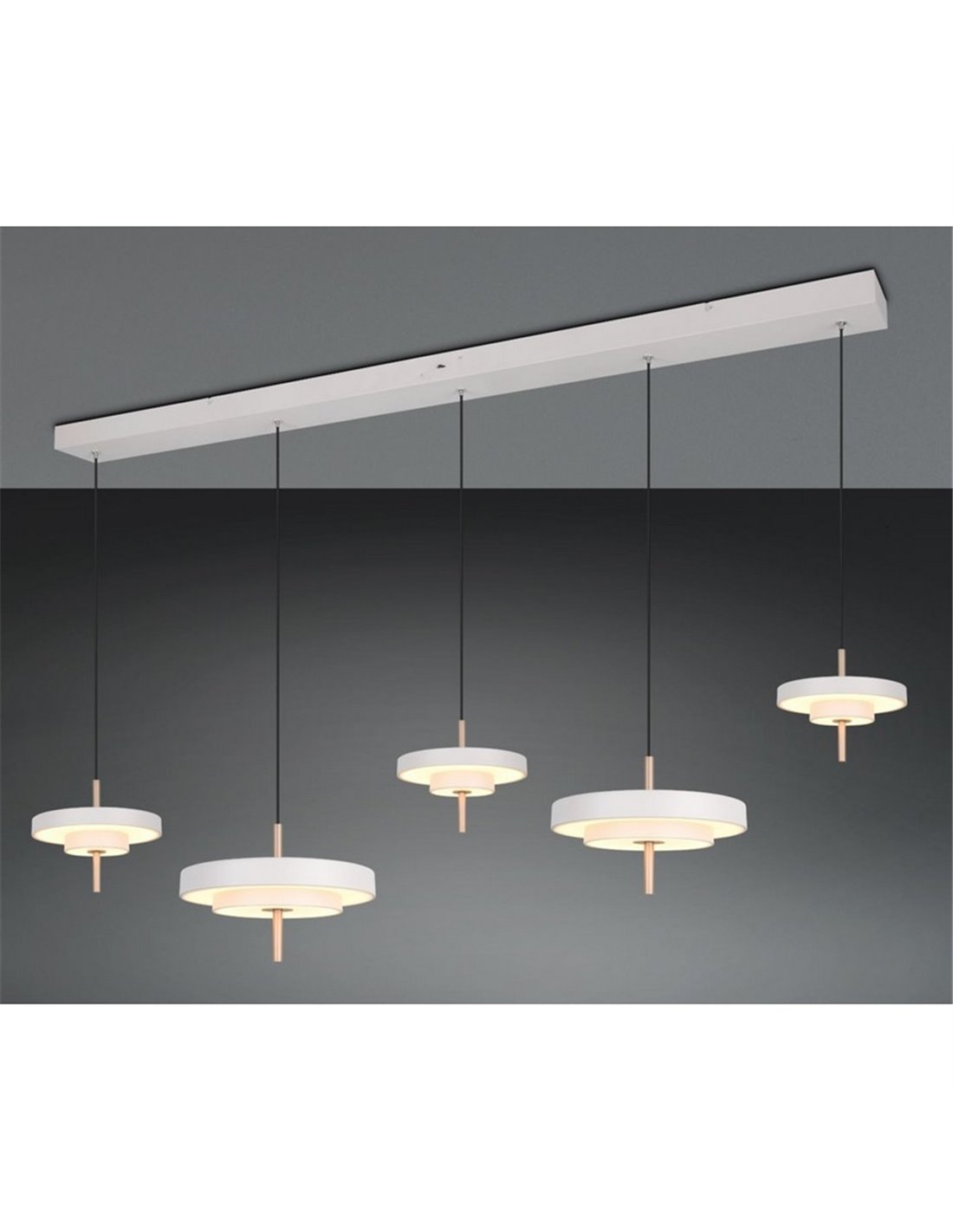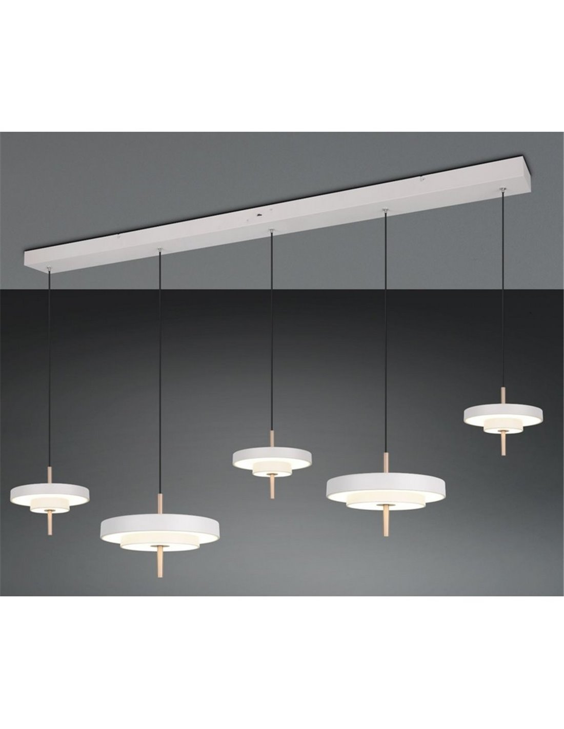 Die KEATON 5 Lichter ist darauf ausgelegt, große Räume und große Esstische effektiv zu beleuchten. Ihre längliche Struktur und die Höhenverstellbarkeit ermöglichen es, sie an verschiedene Konfigurationen anzupassen, während ihre konfigurierbare Beleuchtung sowohl für entspannende Momente als auch für Aktivitäten, die eine neutralere Beleuchtung erfordern, Vielseitigkeit hinzufügt.