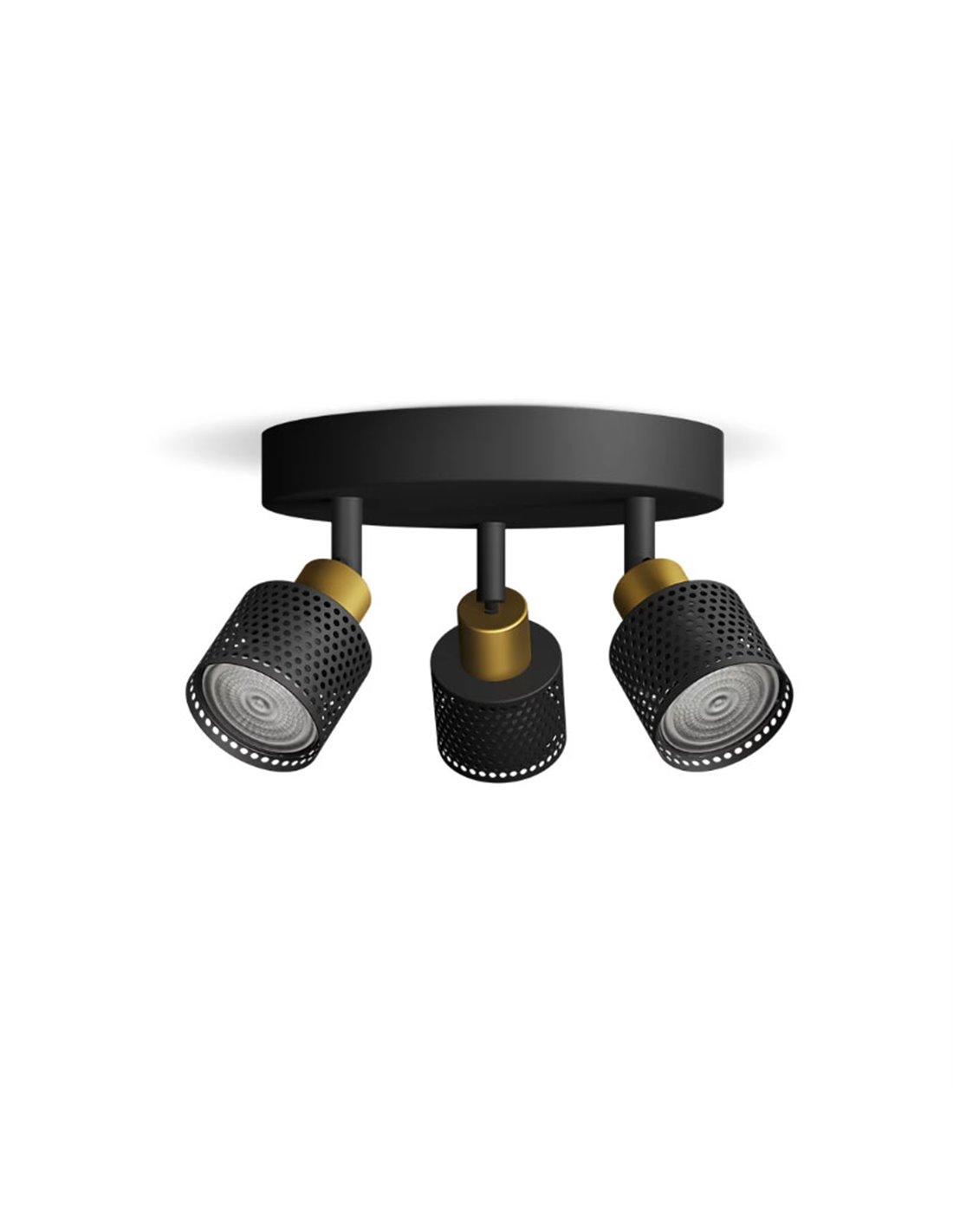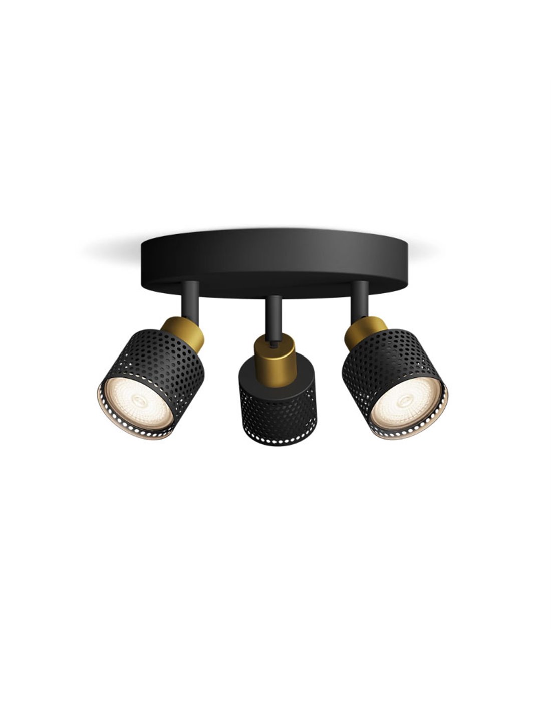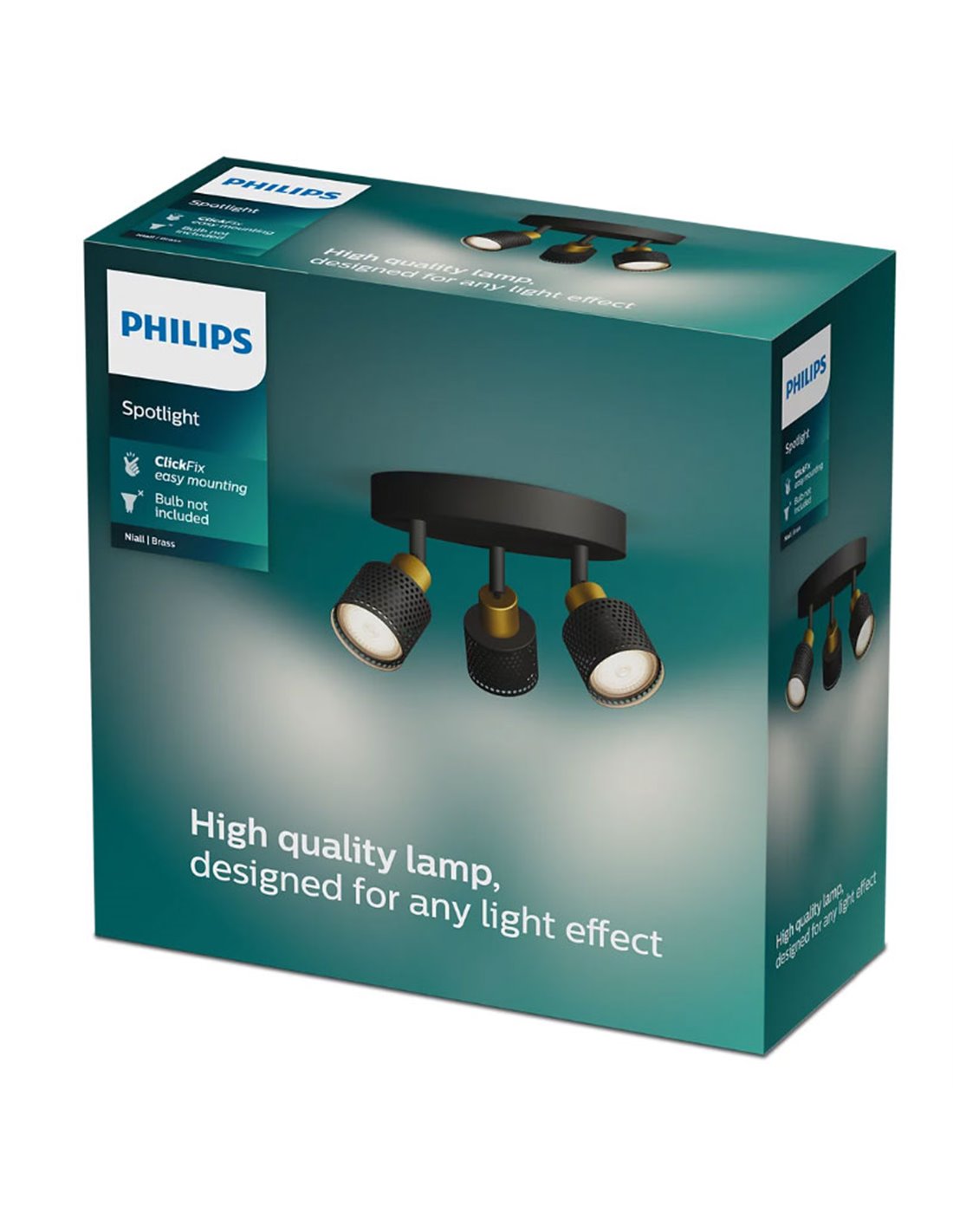 Die Deckenleuchte mit 3 NIALL-Spotlights von Philips ist die perfekte Lösung für alle, die zeitgemäßen und industriellen Stil in ihrem Zuhause suchen. Mit einem Design aus schwarzem Metall und Messingdetails, kombiniert diese Lampe Funktionalität und Ästhetik und bietet optimale Beleuchtung für Wohnzimmer, Esszimmer, Küche, Schlafzimmer oder Flur.