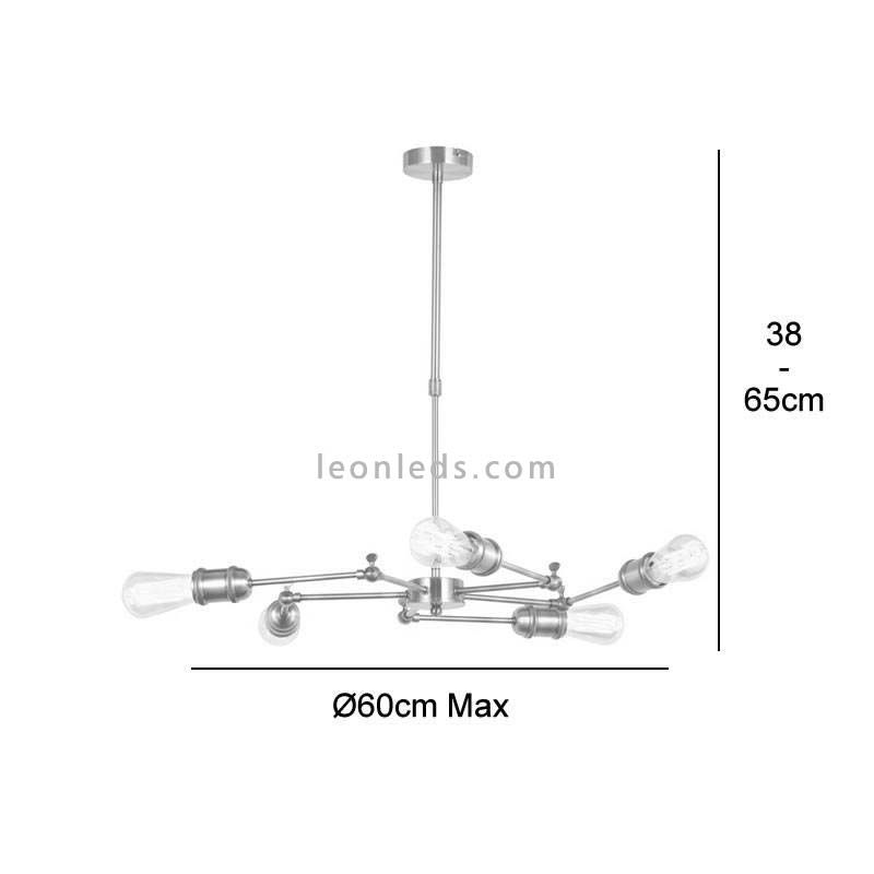 Deckenlampe aus der Atomic-Serie, höhenverstellbar, mit einer Metallstruktur in Bleigrau mit Patina-Effekt. Diese Lampe hat 5 drehbare Arme, die sich durch Lösen einer goldfarbenen Schraube drehen lassen, und 5 Fassungen für den Einsatz von 5 E27-LED-Lampen. Wir empfehlen, 5 LED-Lampen im ST64-Format zu installieren, mit einer Leistung von 4 bis 7W und einer warmweißen Lichtfarbe von 3000k.