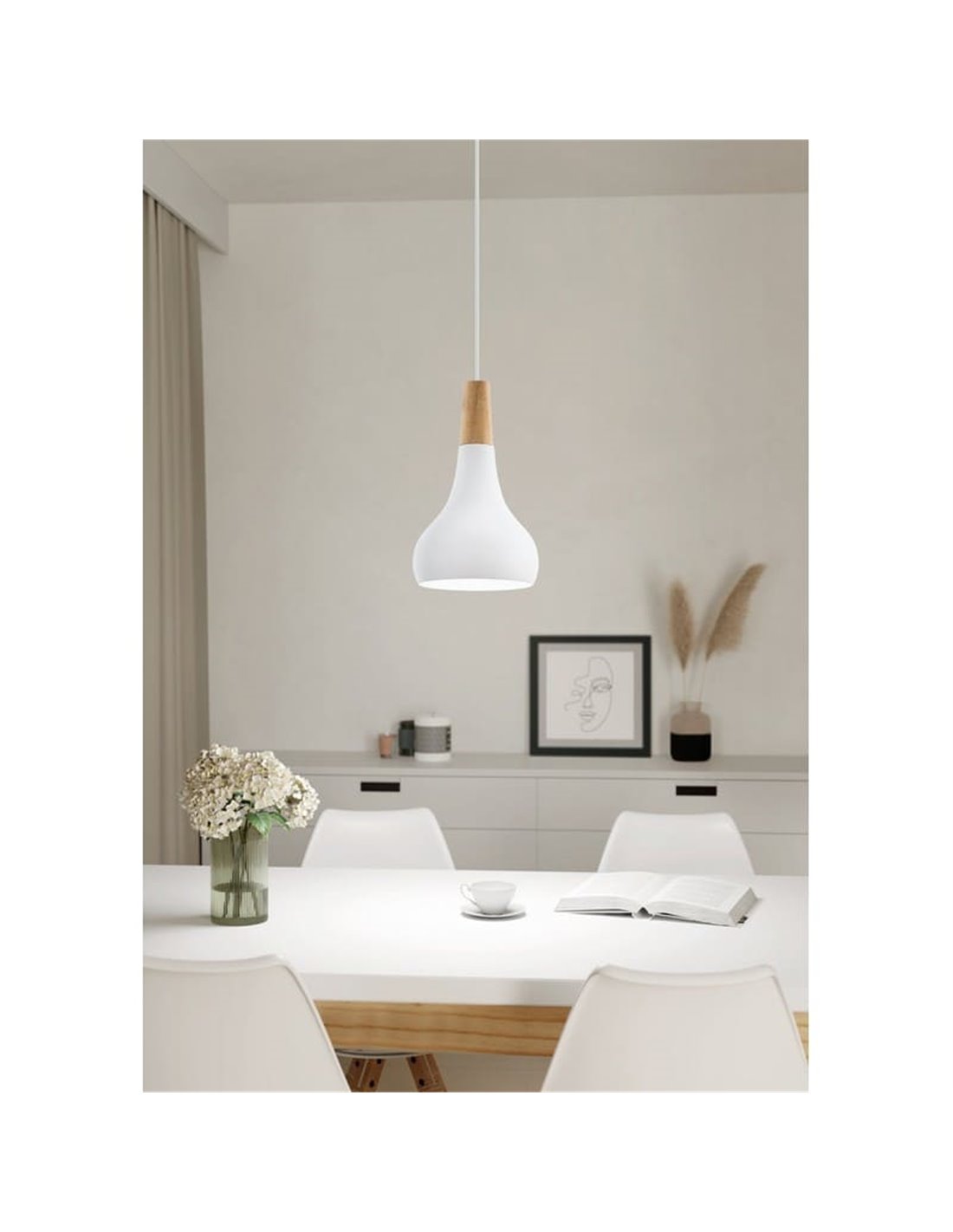 Die Pendelleuchte SABINAR hat eine Silhouette mit klaren Linien und einer Struktur aus Stahl und Holz, die in Weiß und Holz verarbeitet ist. Der Schirm wird mit einem verstellbaren Kabel aufgehängt, um die Höhe an den Raum anzupassen. Der Diffusor sorgt für eine gleichmäßige Beleuchtung ohne Blendung.