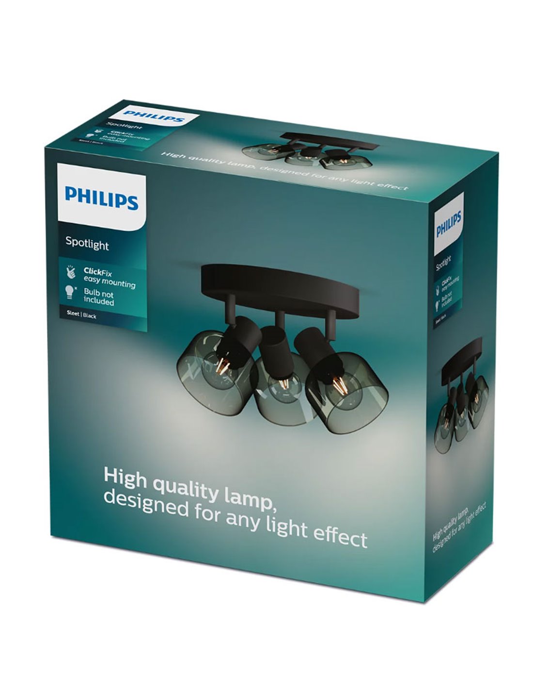 Deckenplafond SLEET mit 3 rauchschwarzen Glasstrahlern. Kompatibel mit 3 E14 Leuchten (nicht im Lieferumfang enthalten). Einfache Installation dank des ClickFix-Systems. Modernes Design für jeden Raum.