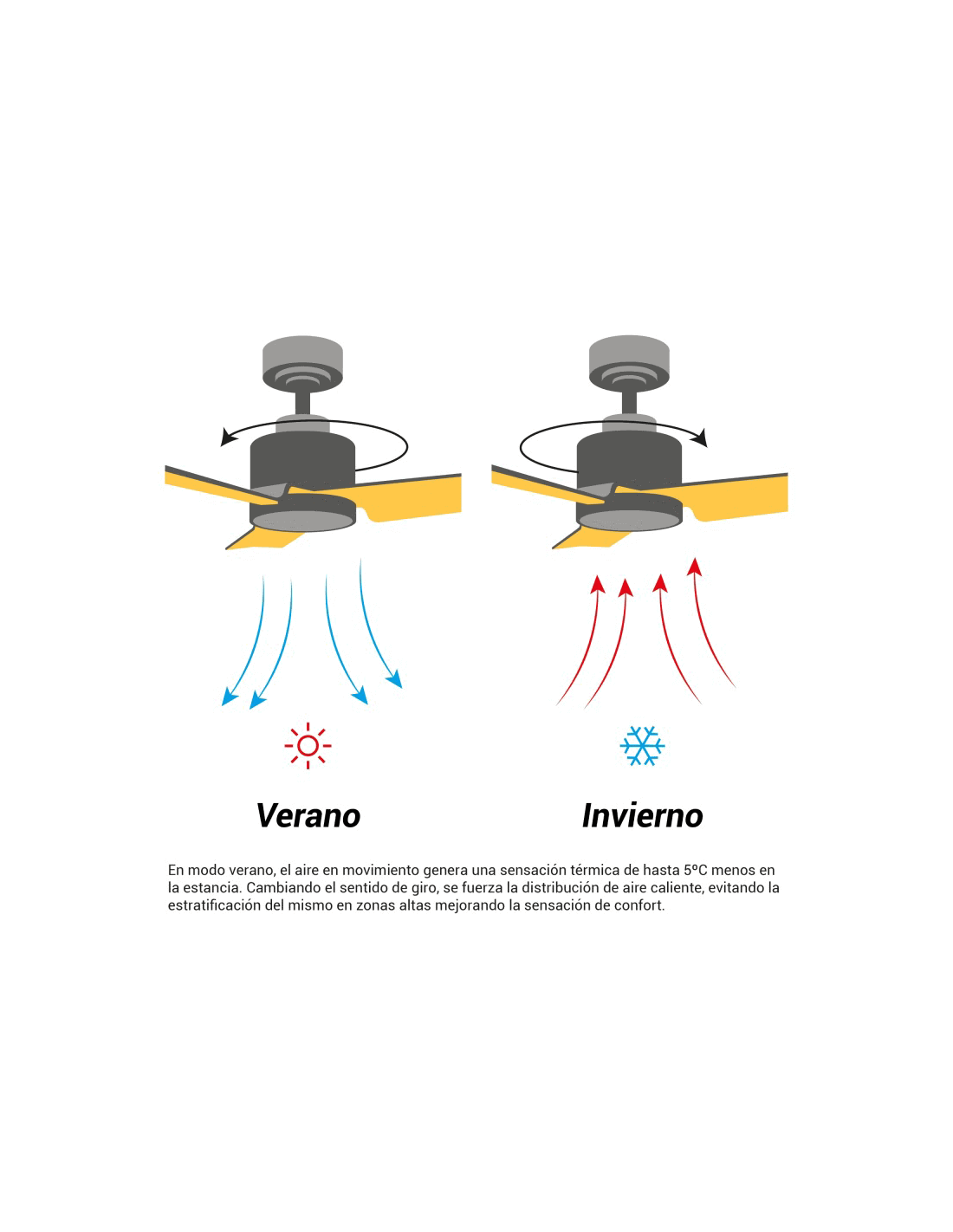 Die Leuchte hat eine maximale Leistung von 20W, bietet 2.000 Lumen und eine einstellbare Farbtemperatur (2700K - 3300K - 4000K). Genießen Sie ein elegantes Produkt, das sich Ihrer Stimmung anpasst, von warmen bis neutralen Atmosphären. Sein Schutz IP20 macht ihn zum perfekten Deckenventilator für den Innenbereich.