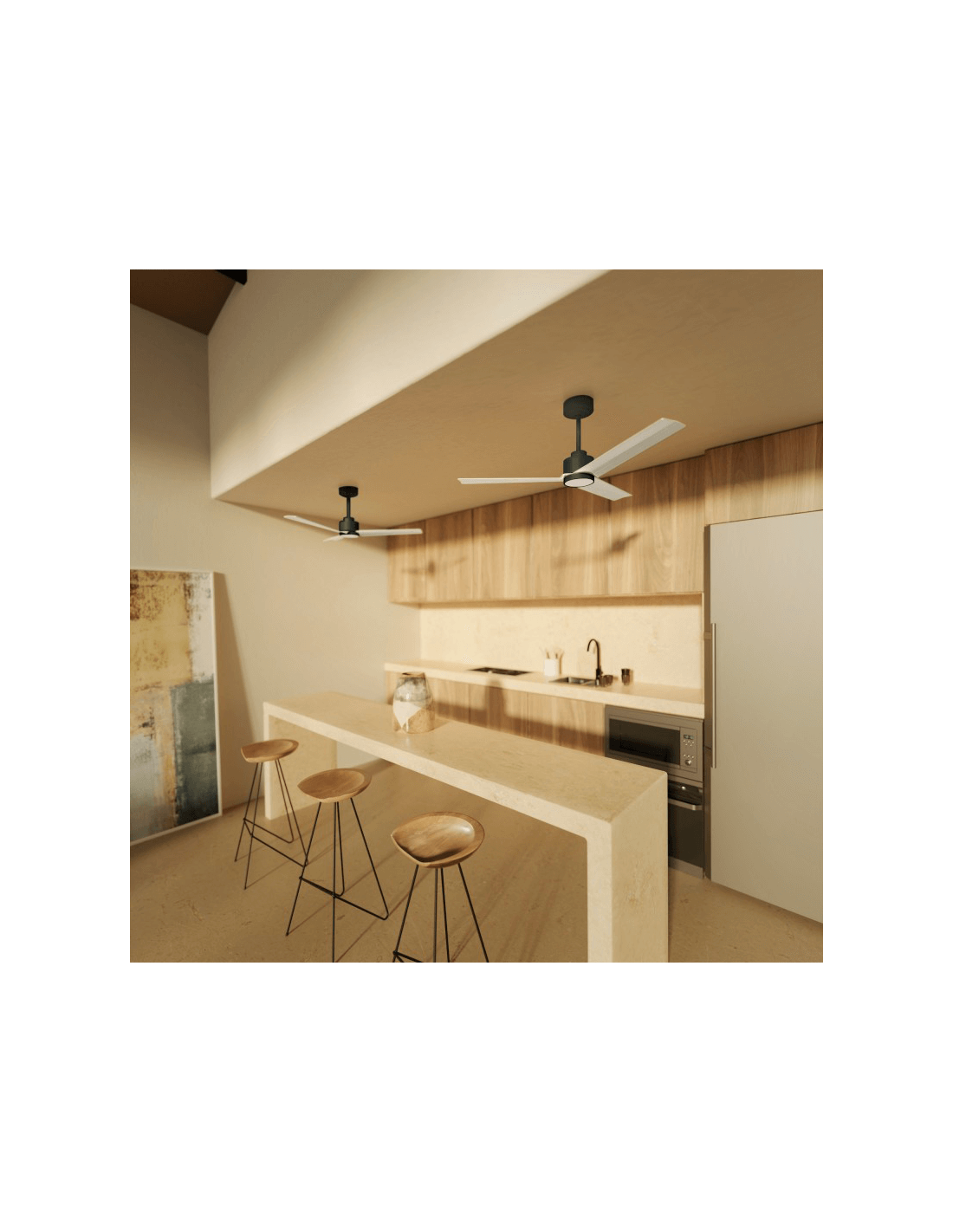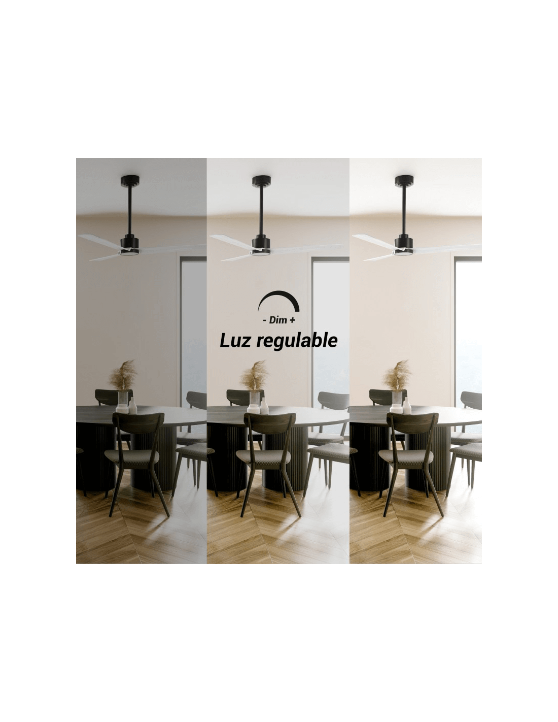 Er ist mit oder ohne Licht erhältlich, beinhaltet eine Sommer-Winter-Funktion, die es ermöglicht, ihn das ganze Jahr über zu genießen, einen Timer und einen ultra-leisen DC-Motor mit niedrigem Energieverbrauch. Der Ventilator Anne schwarz hat 3 Blätter und einen PMMA-Diffusor.