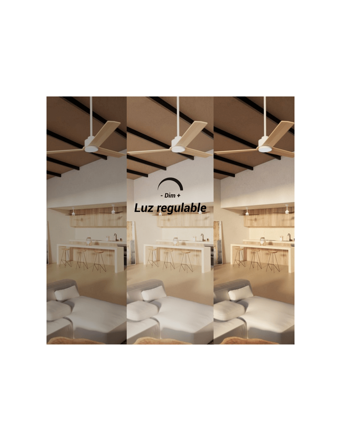 Die Leuchte hat eine maximale Leistung von 20W, bietet 2.000 Lumen und eine einstellbare Farbtemperatur (2700K - 3300K - 4000K). Sein Schutz IP20 macht ihn zum perfekten Deckenventilator für den Innenbereich wie Küchen, Wohnzimmer oder Schlafzimmer.