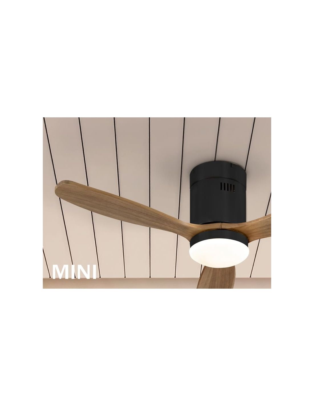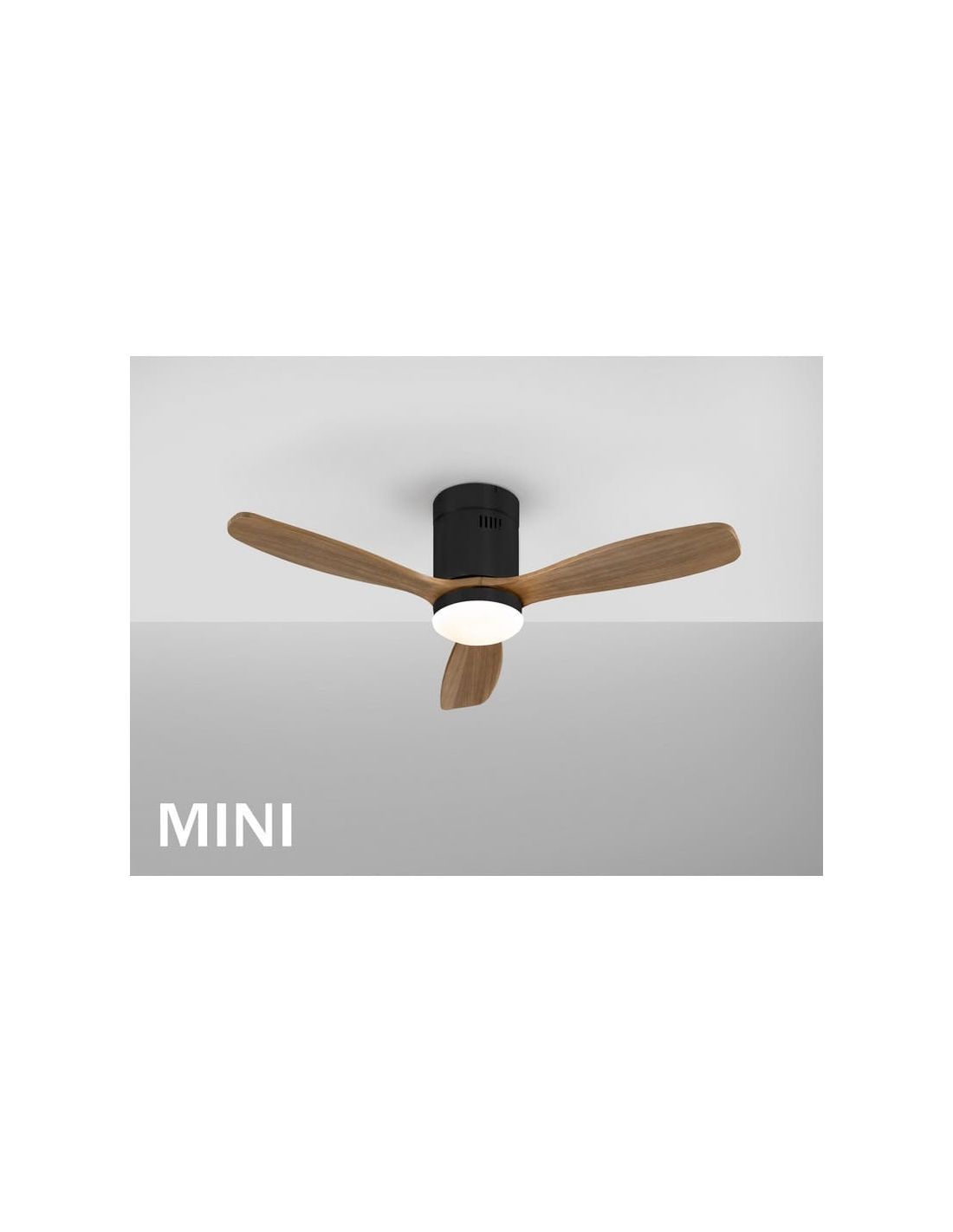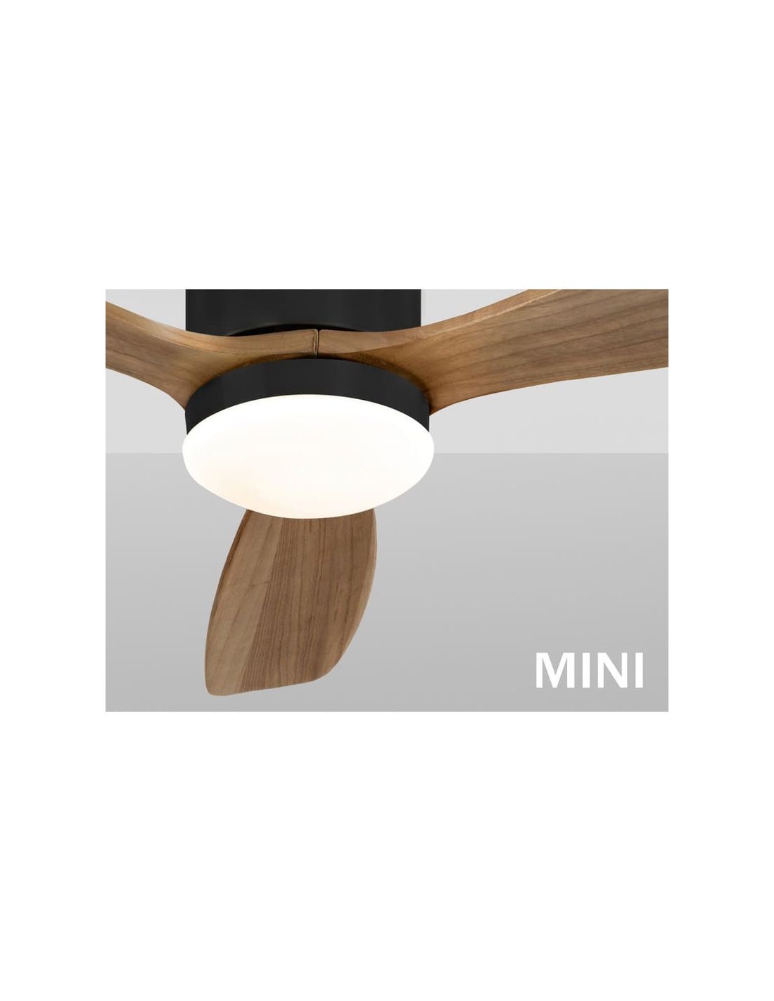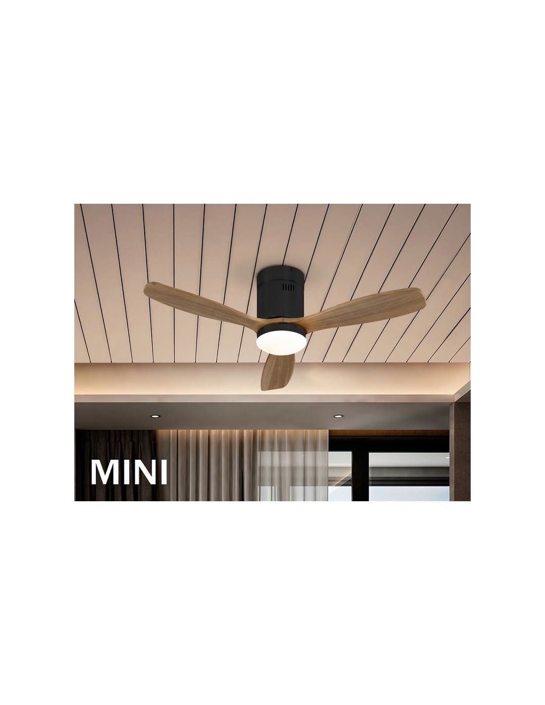 Entdecken Sie unseren Deckenventilator mit LED-Licht in matt schwarz und Blättern aus Nussbaumholz. DC-Motor mit 10W, LED CCT mit 3 Farbtemperaturen und integrierter Fernbedienung für bequeme Steuerung.