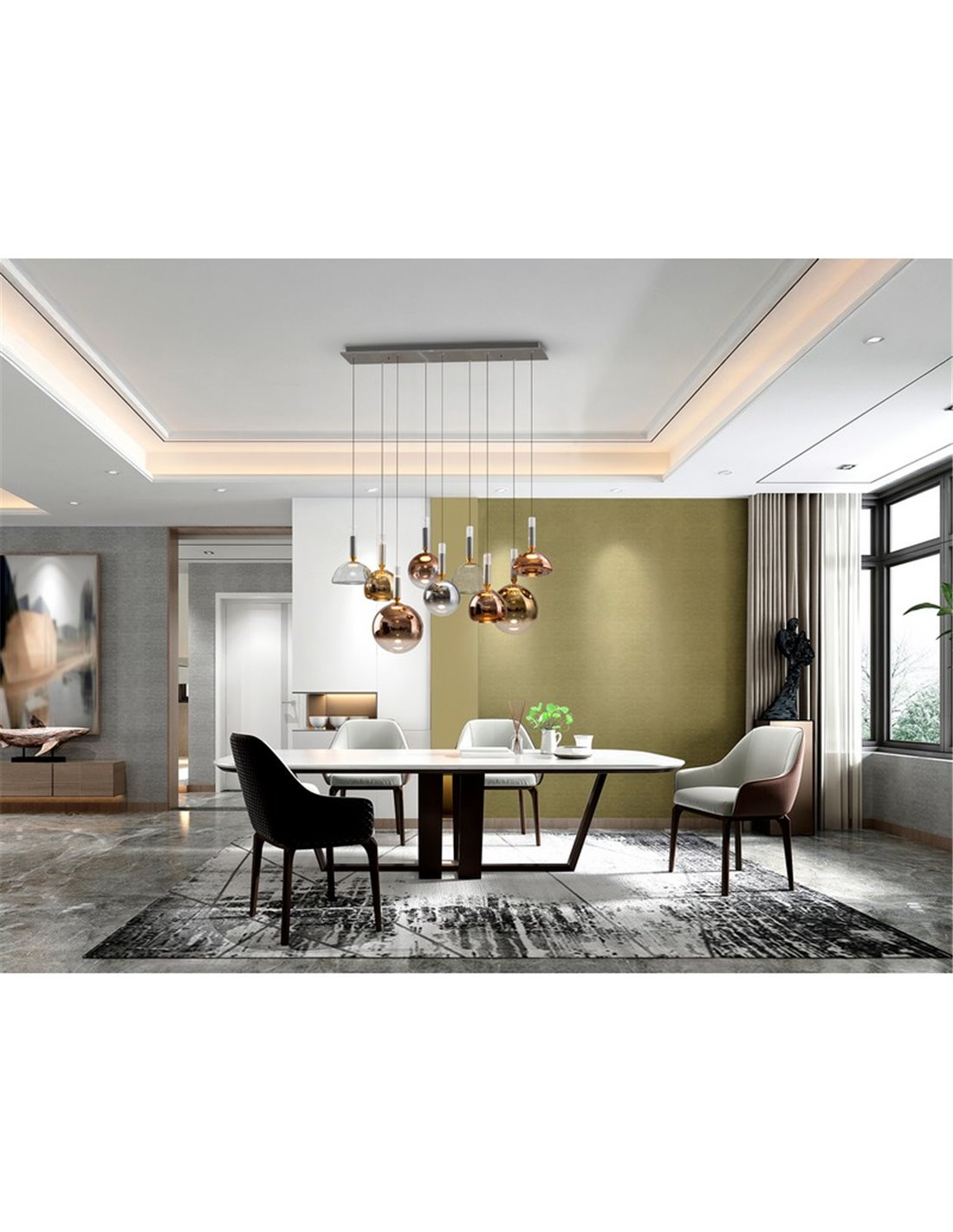 Die CHARLIZE 9 Lichter eignet sich ideal für Wohnzimmer, Esszimmer oder dekorative Bereiche, in denen eine dimmbare Lampe mit einem eleganten und hervorstechenden Design gewünscht wird.