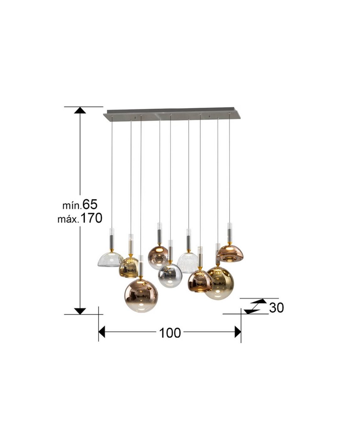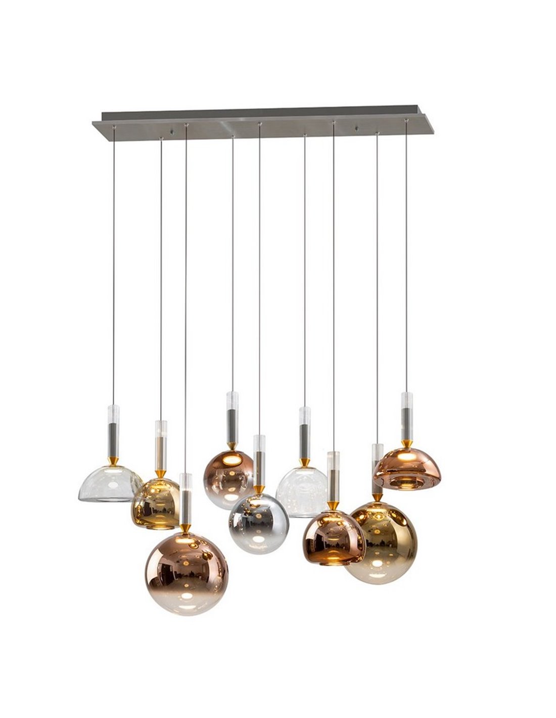 Die Deckenlampe CHARLIZE mit 9 LED-Lichtern besteht aus gebürstetem Aluminium mit dunkelgrauem Finish und hat spiegelglänzende Glasschirme in Kupfer-, Gold-, Silber- und klaren Glasfarben, mit opalem Acryldiffusor. Sie integriert 54W LED, mit 1.980 lm und warmem Licht 3000K. Sie ist dimmbar und hat eine höhenverstellbare Funktion.