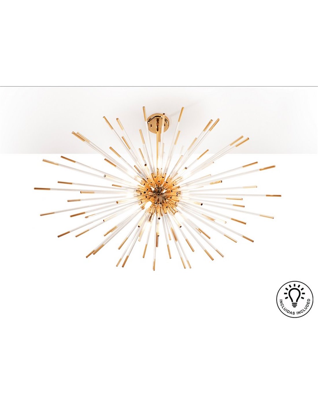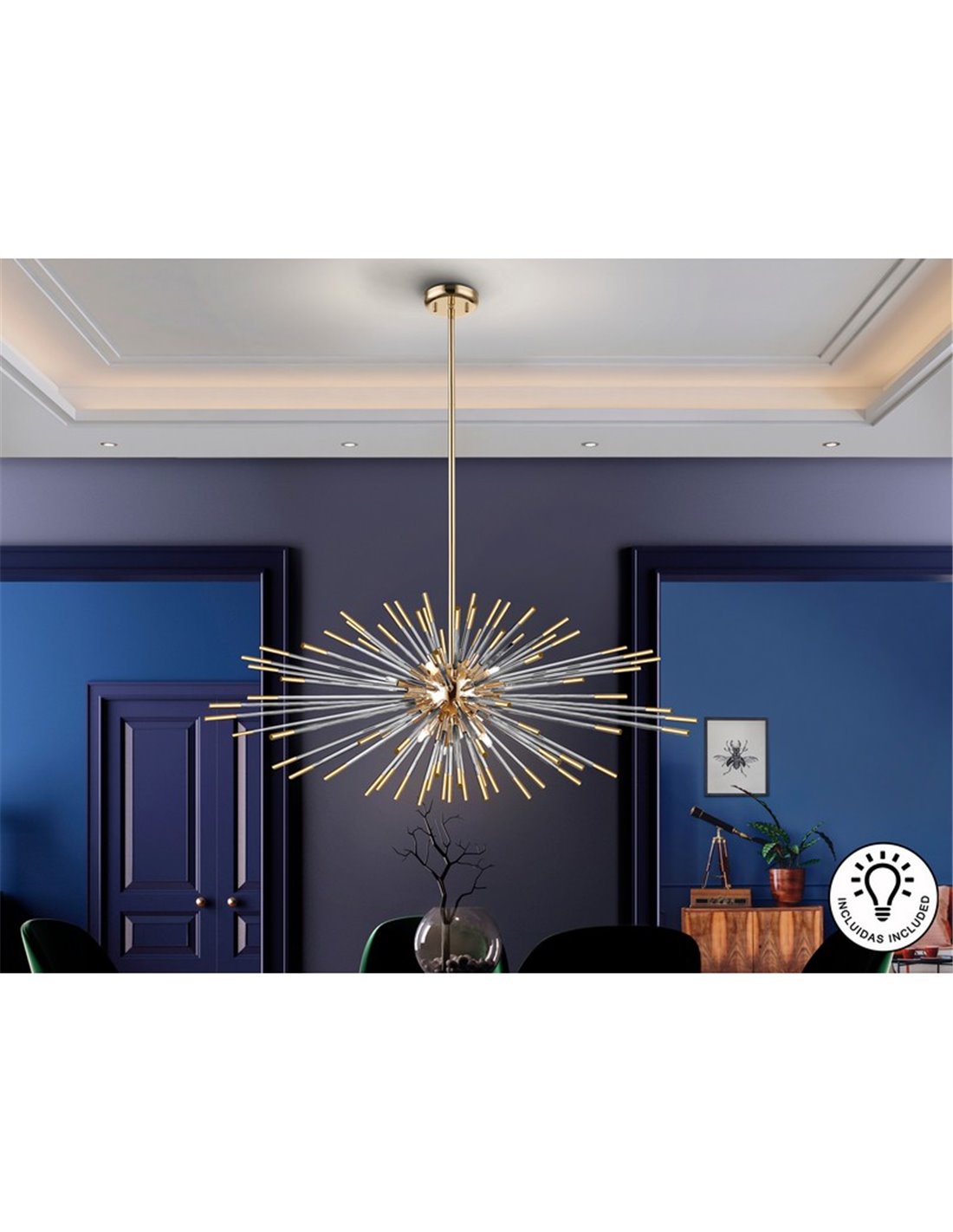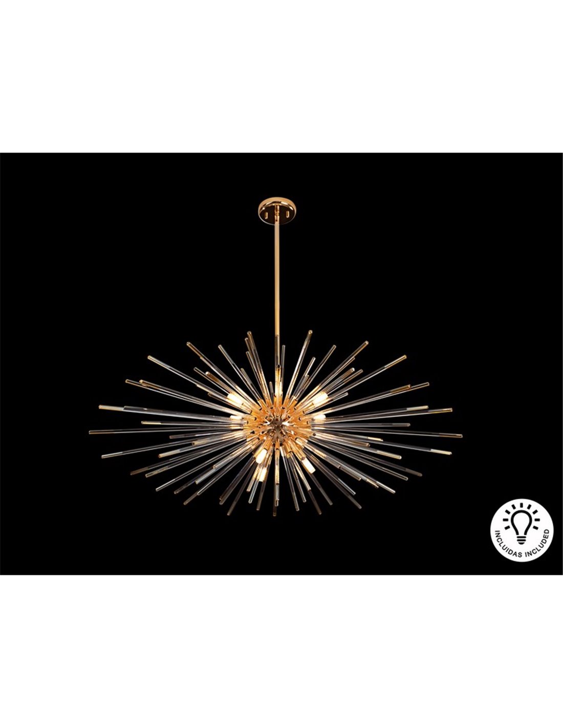 Die EVASIÓN ist eine Deckenlampe mit starkem visuellen Auftreten, bestehend aus einer metallisch goldglänzenden sphärischen Struktur, von der radiale Stangen aus klarem Glas abgehen, die mit feinen Details in Bernsteinfarbe verziert sind. Ein elegantes und dekoratives Design, das als Hauptstück im Raum fungiert.