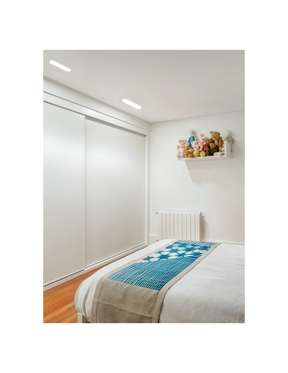 Es kann in jedem Raum eingelassen mit einem rechteckigen Schnittloch installiert werden. Wenn es in der Nähe von Wänden oder Möbeln installiert wird, können wir einzigartige Lichtbäder schaffen und unserem Raum (Wohnzimmer, Schlafzimmer, Flure, öffentliche Gebäude oder jeden anderen kommerziellen Raum) einen besonderen Touch verleihen. Dank IP54 kann es in feuchten oder schmutzigen Umgebungen installiert werden, wie zum Beispiel in Küchen oder Badezimmern.