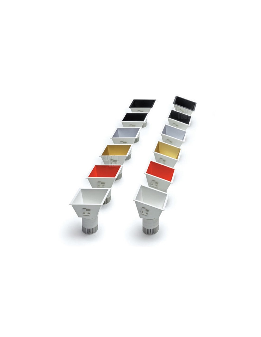 Downlight quadratisch asymmetrisch LED mit einer Leistung von 7W, verfügbar in 3 Lichttönen 2700K, 3000K und 4000K mit einer Lichtintensität von 910Lm, 940Lm und 960Lm respektiv, einem Lichtstrahlwinkel von 52° und in 6 verschiedenen Farben erhältlich.