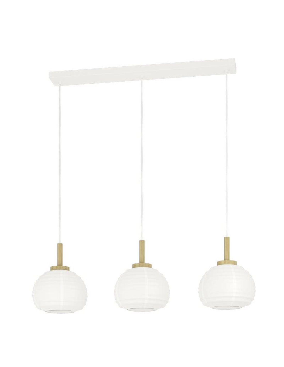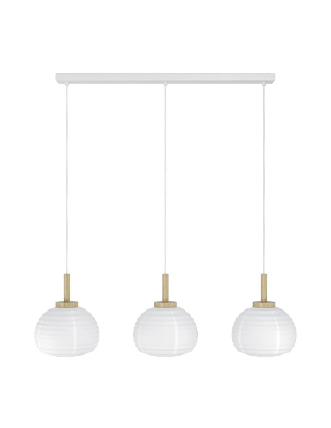 Dreifach-Pendelleuchte SUMMERHILL von Eglo mit drei weißen Papier-Schirmen und Holzelementen. Kompatibel mit E27-Glühbirnen (nicht enthalten). Ideal zur Beleuchtung großer Esszimmer und Wohnzimmer mit einem modernen und natürlichen Akzent.