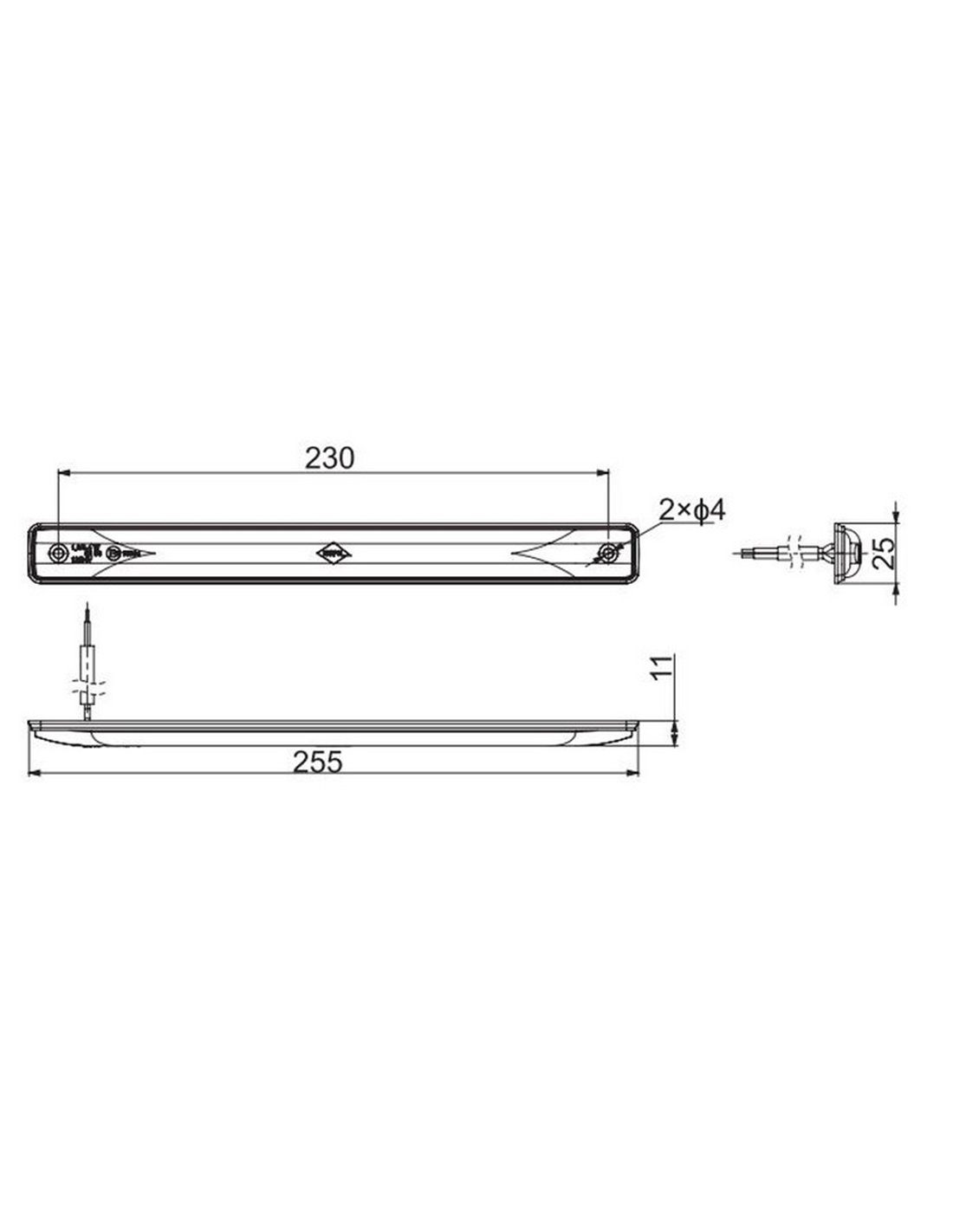 Abmessungen: 255×25 mm | Beleuchtete Fläche 230 mm | Dicke 11 mm | Befestigung 2ר4 mm.