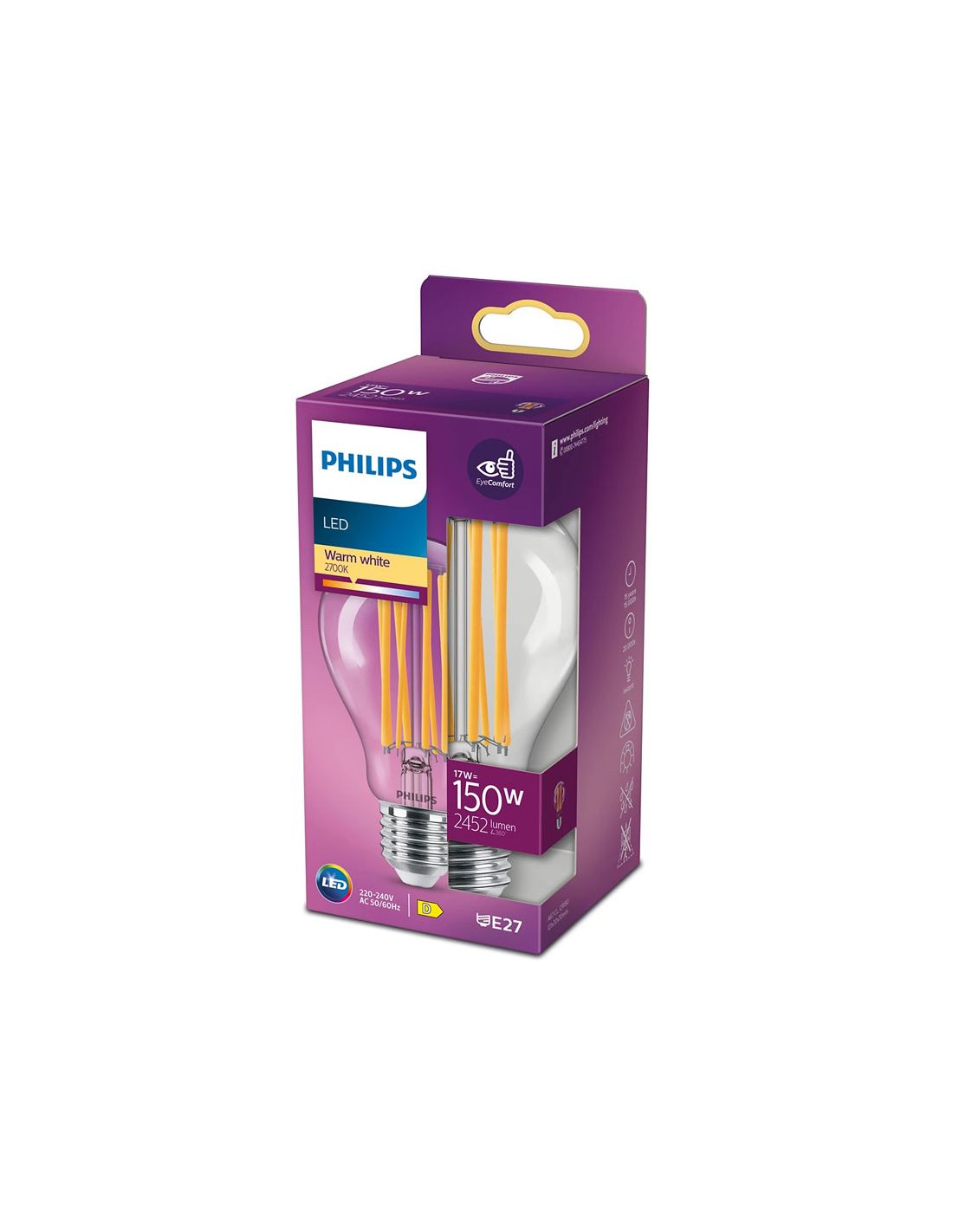 E27 LED Filament Birne A67 LED classic hat eine Lebensdauer von 15.000 Stunden und Philips bietet eine Garantie von 2 Jahren. Neben ihrem Design verfügt sie über die fortschrittlichste Technologie, die eine Einsparung von bis zu 90% des verbrauchten Stroms ermöglicht. Sie hat einen Verbrauch von 17kWh/1000h.