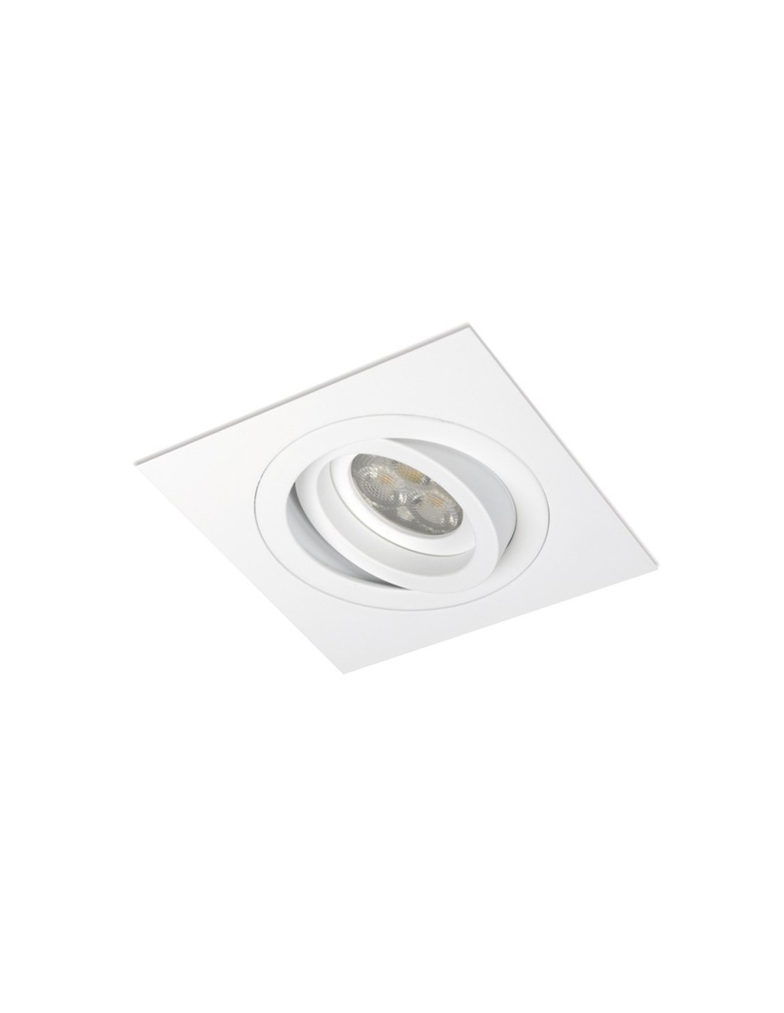 Quadratischer Einbaustrahler für GU10 dicroische LED-Glühbirnen oder MR16, schwenkbar 45º mit einem Gehäuse aus weißem Aluminium.