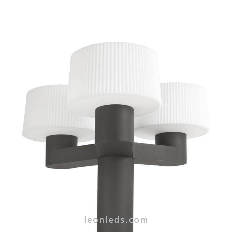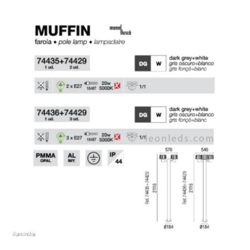 Gartenlaterne mit 3 Armen aus der Kollektion Muffin von Faro Barcelona zur Installation im Außenbereich, benötigt 3 LED-Birnen mit E27-Fassung (nicht enthalten), aus hochwertigem dunkelgrauem Aluminium gefertigt und einem lichtdiffusierenden PMMA mit hoher Widerstandsfähigkeit. Sie hat einen Schutzgrad von IP44 und wird durch 4 Schrauben im Außenboden installiert, einschließlich Dübel, Schrauben und Installationshandbuch. Diese Laterne besteht aus einem Mast mit 3 Armen (74436) und 3 Muffin-Schirmen (74429).