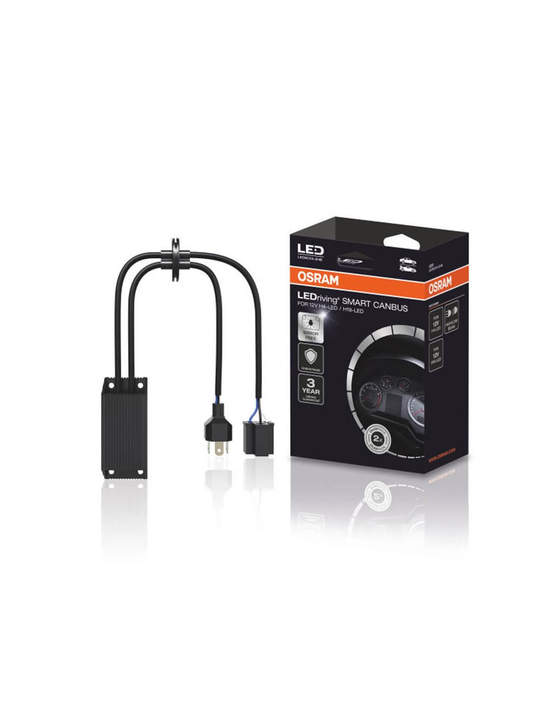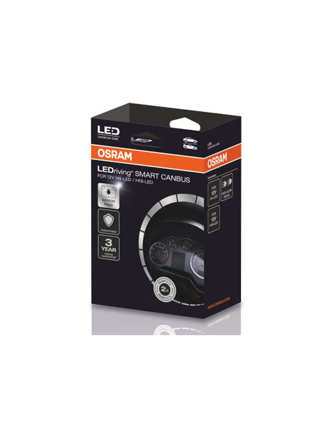 CanBus und Fehlerbehebungsadapter für bestimmte Fahrzeuge der Marke Osram Smart Canbus Error Canceller mit Referenz LEDSC04 für LED-Lampen H4 H19 von Osram, überprüfen Sie die Kompatibilität mit Ihrem Fahrzeug in den Fotos oder auf der Website von Osram. Geeignet für LED-Straßenlampen, Abblendlicht und Nebelscheinwerfer.