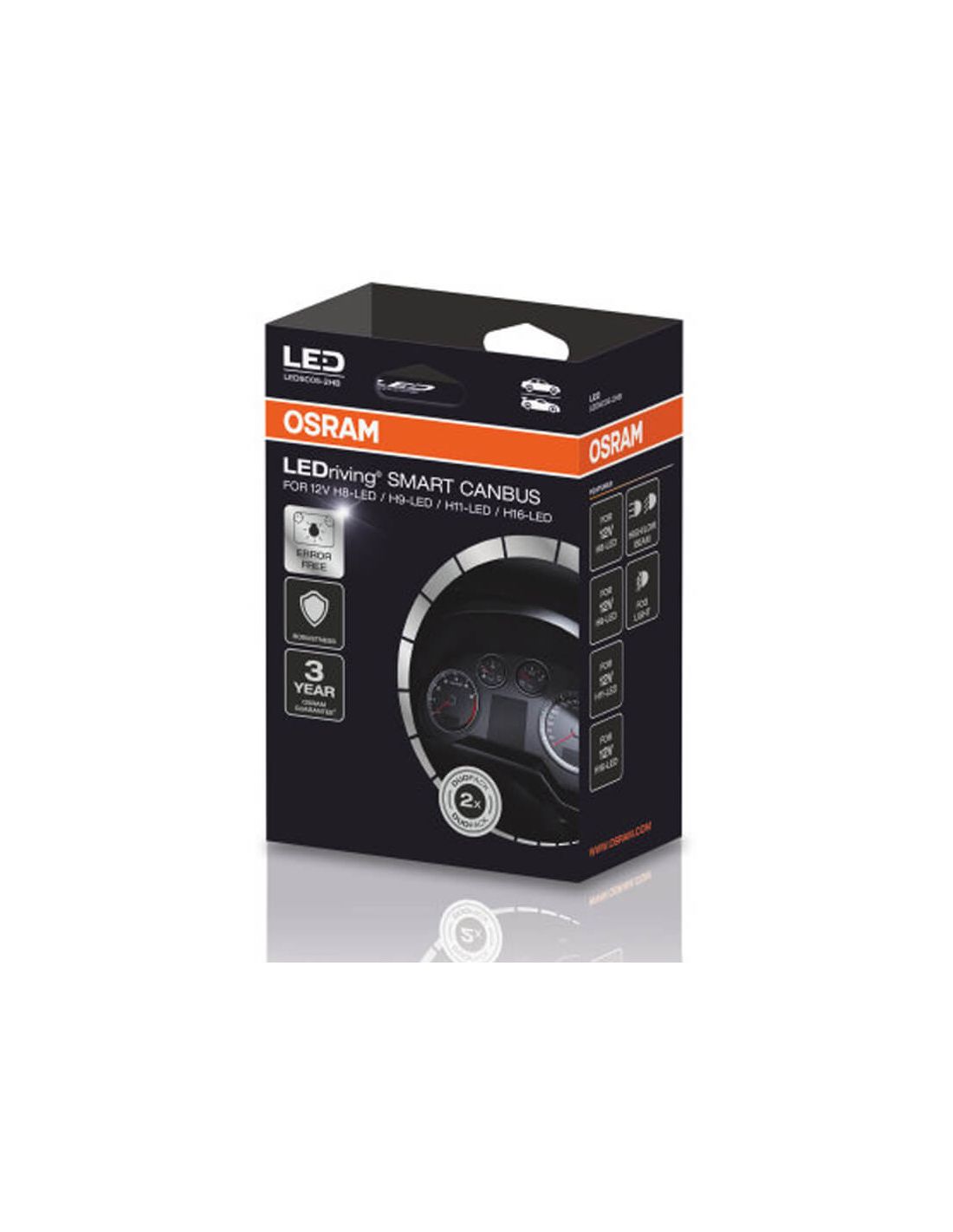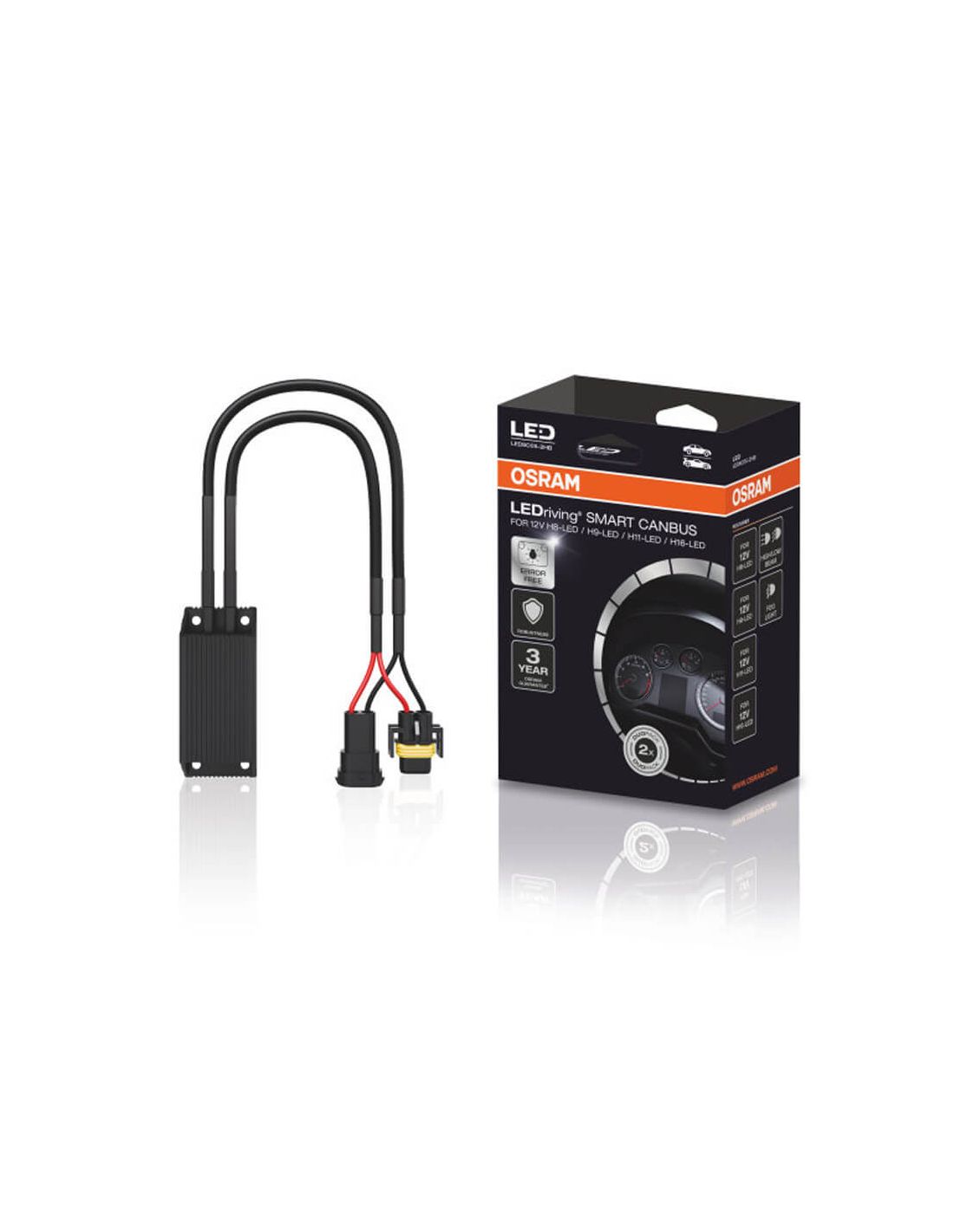Zubehör zur Fehler- und Flimmerbehebung für bestimmte Automodelle, überprüfen Sie auf der Website von Osram oder in einem der Fotos, ob es für Ihr Fahrzeug geeignet ist, wird zusammen mit den LED-Lampen H8, H9, H11 und H16 installiert. Enthält 2 Smart Canbus Error Canceller mit spezifischem Fahrzeugstecker, Referenz LEDSC05.2HB.