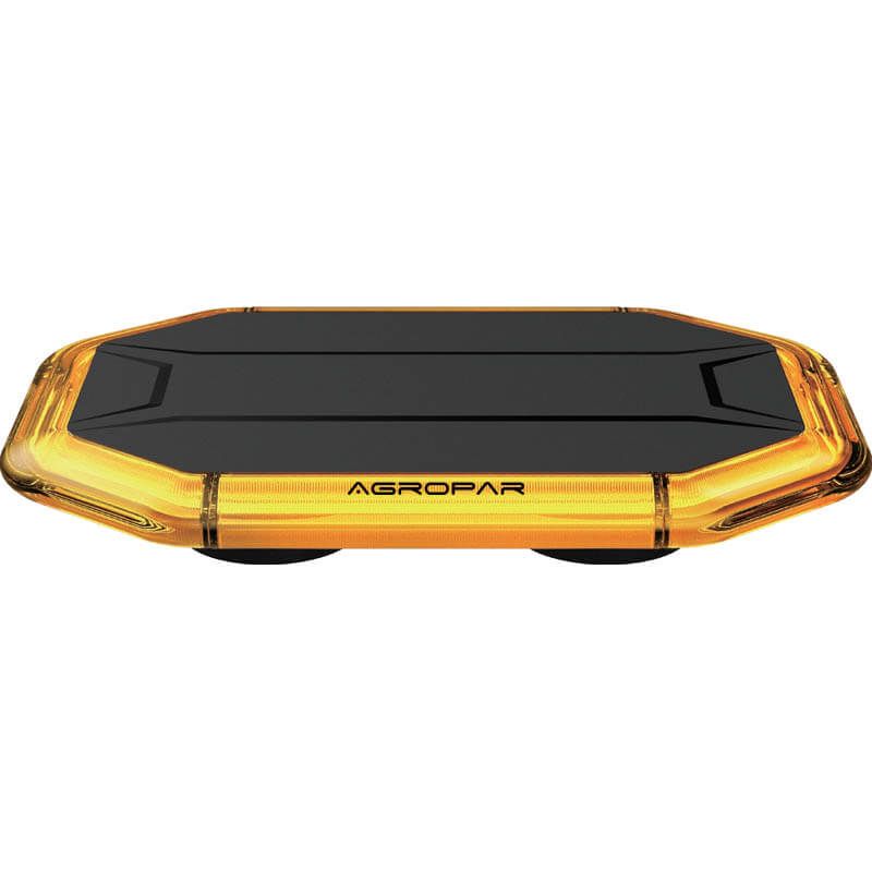 Flacher LED-Amberbrücke mit magnetischer Befestigung geeignet für Spannungen von 10 bis 30 Volt, einschließlich 2,5 Meter Kabel mit Zigarettenanzünderanschluss und einem Ein/Ausschalter sowie einem weiteren Schalter zur Veränderung der Lichtfrequenz. Diese LED-Brücke ist homologiert und kann in einem Traktor anstelle des rotierenden LED verwendet werden.