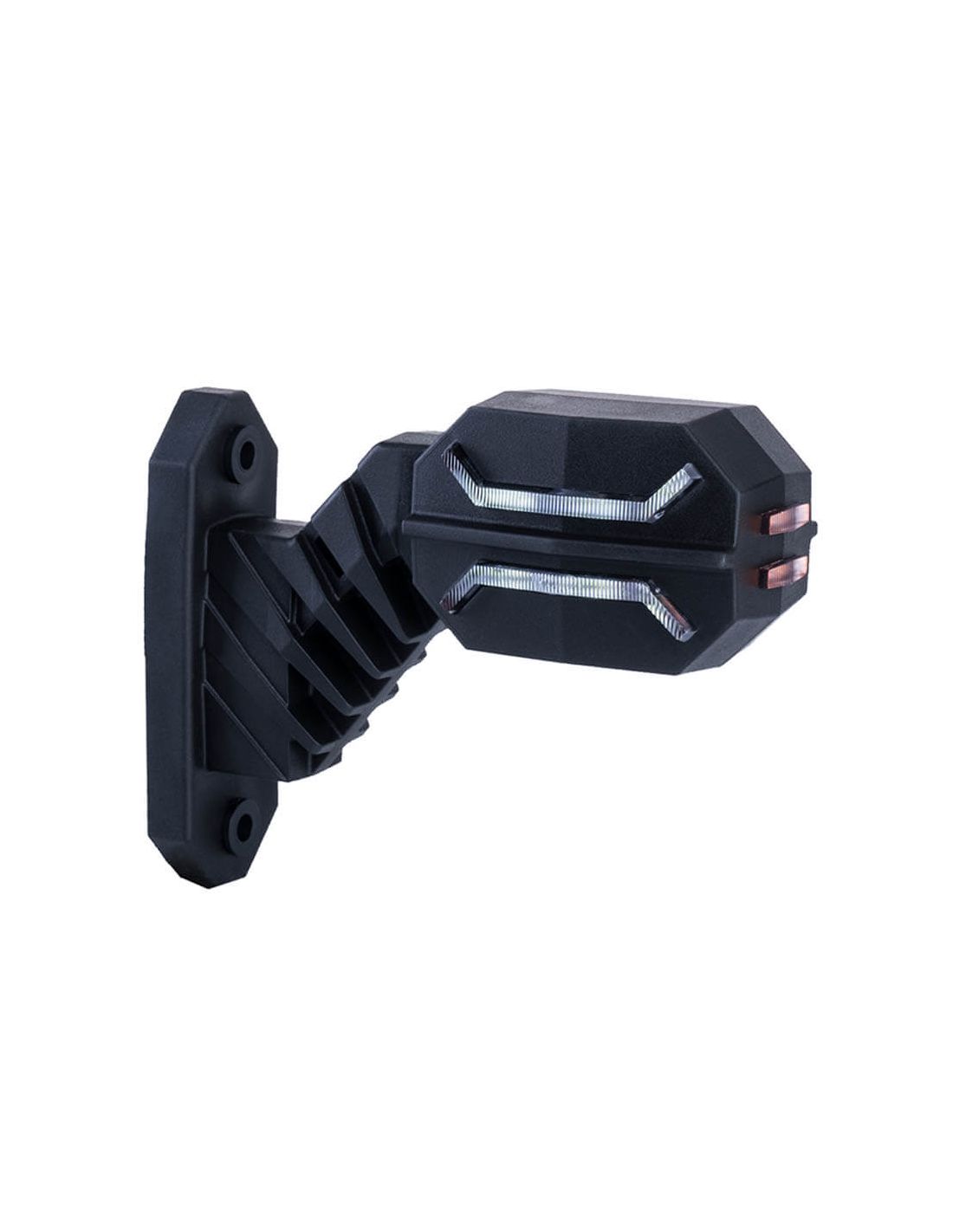 Kurzes, gebogenes LED-Seitenmarkierungssignal für Anhänger mit 3 Funktionen, rotes Rücklicht, weißes Vorderlicht und orangefarbenes Seitenlicht, sowohl das Vorder- als auch das Rücklicht beleuchtet und innen gibt es Linien, die im ausgeschalteten Zustand transparent erscheinen, vorne klar, hinten rot und seitlich orange. Es kann mit 12 Volt und 24 Volt installiert werden und hat 0,5 Meter Kabel für die Installation. Völlig dicht, tauchfähig und mit einer völlig flexiblen Struktur.