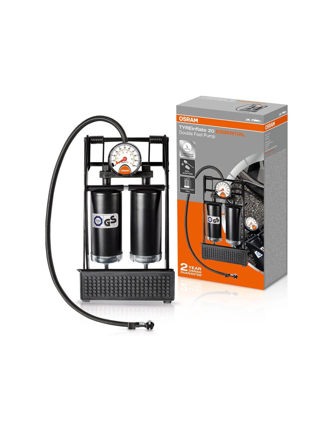 Die Fußpumpe OSRAM TYREinflate 20 ESSENTIAL verfügt über einen Doppelzylinder für schnelleres Aufpumpen, großes Manometer für einfache Ablesung und rutschfestes Fußpedal. Kompatibel mit Autos, Motorrädern, Fahrrädern und Bällen.