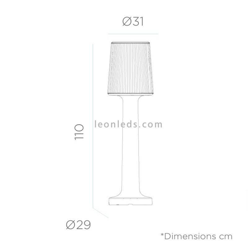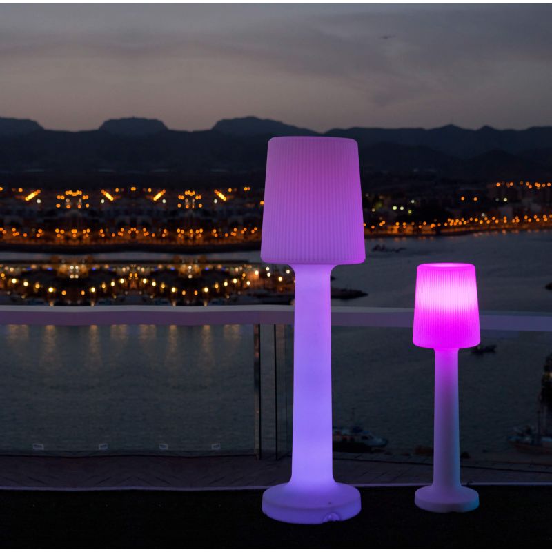 Die wiederaufladbare Außenlampe Carmen 110 oder 165 cm ist aus weißem Polyethylen gefertigt und hat einen Schutzgrad IP54, der sie für die Beleuchtung von Innen- und Außenbereichen geeignet macht. Sie funktioniert mit integrierter LED-Technologie in mehr als 250 Farben RGB + 6000K, der Lichtton und die Intensität können mit der beiligenden Fernbedienung reguliert werden.