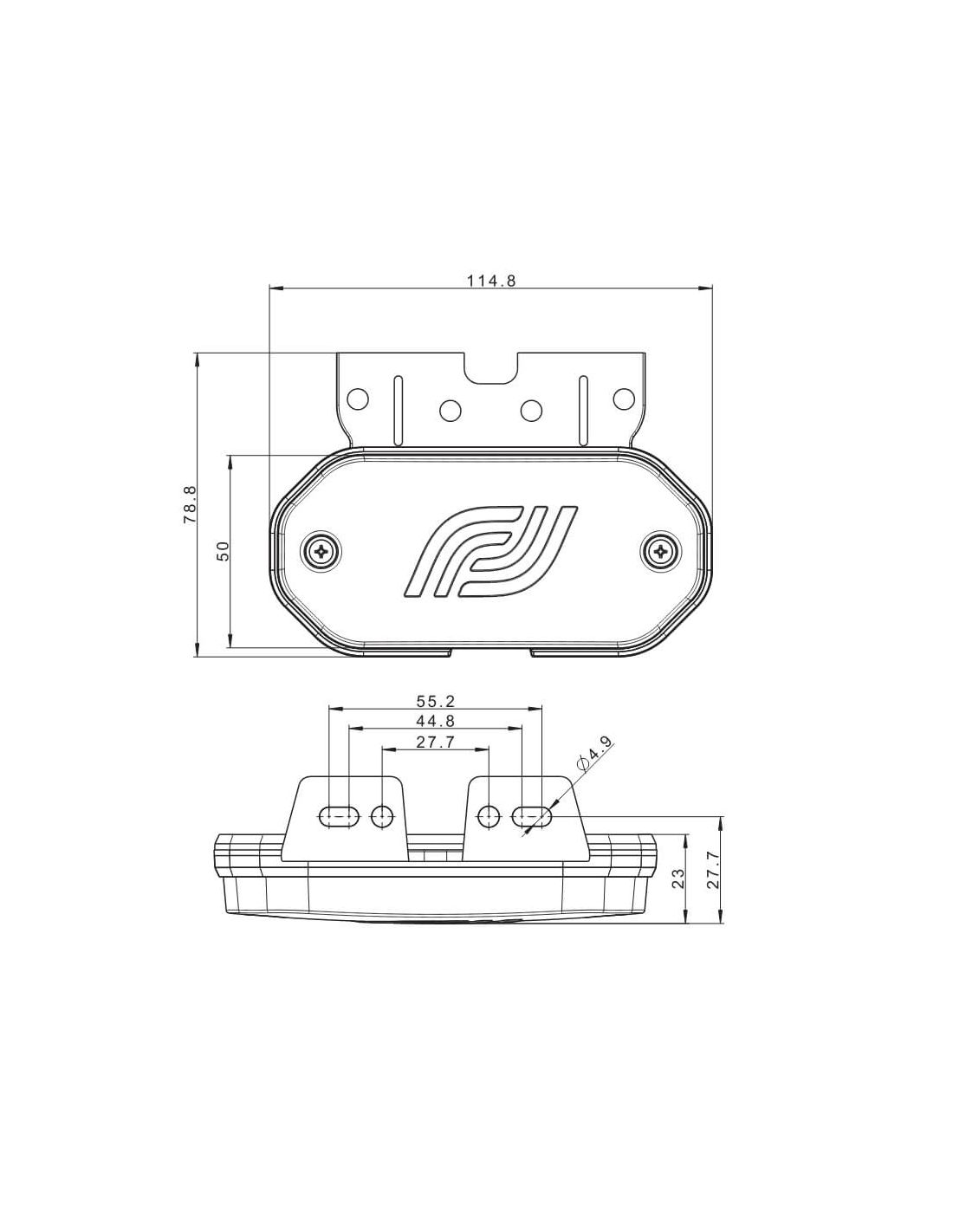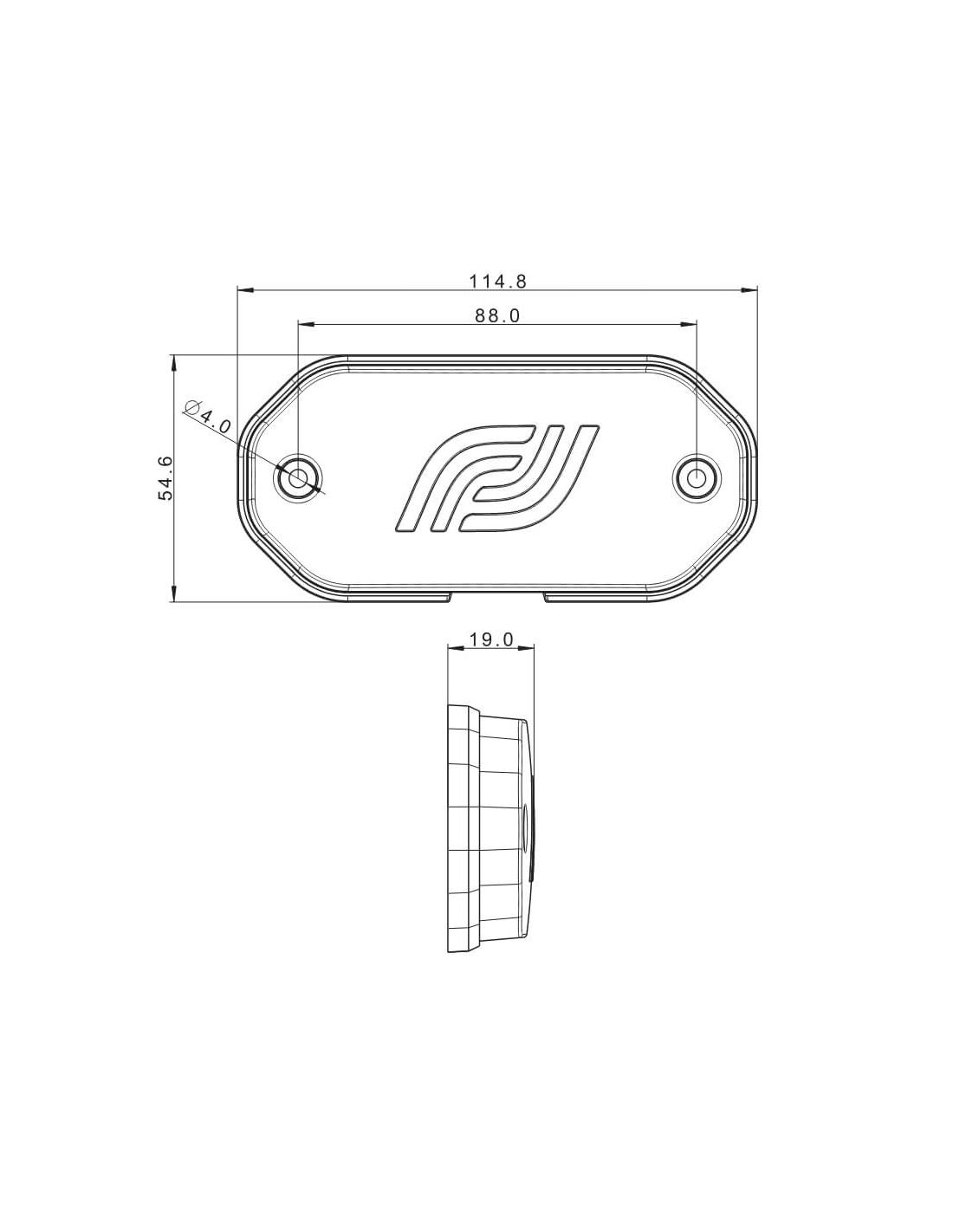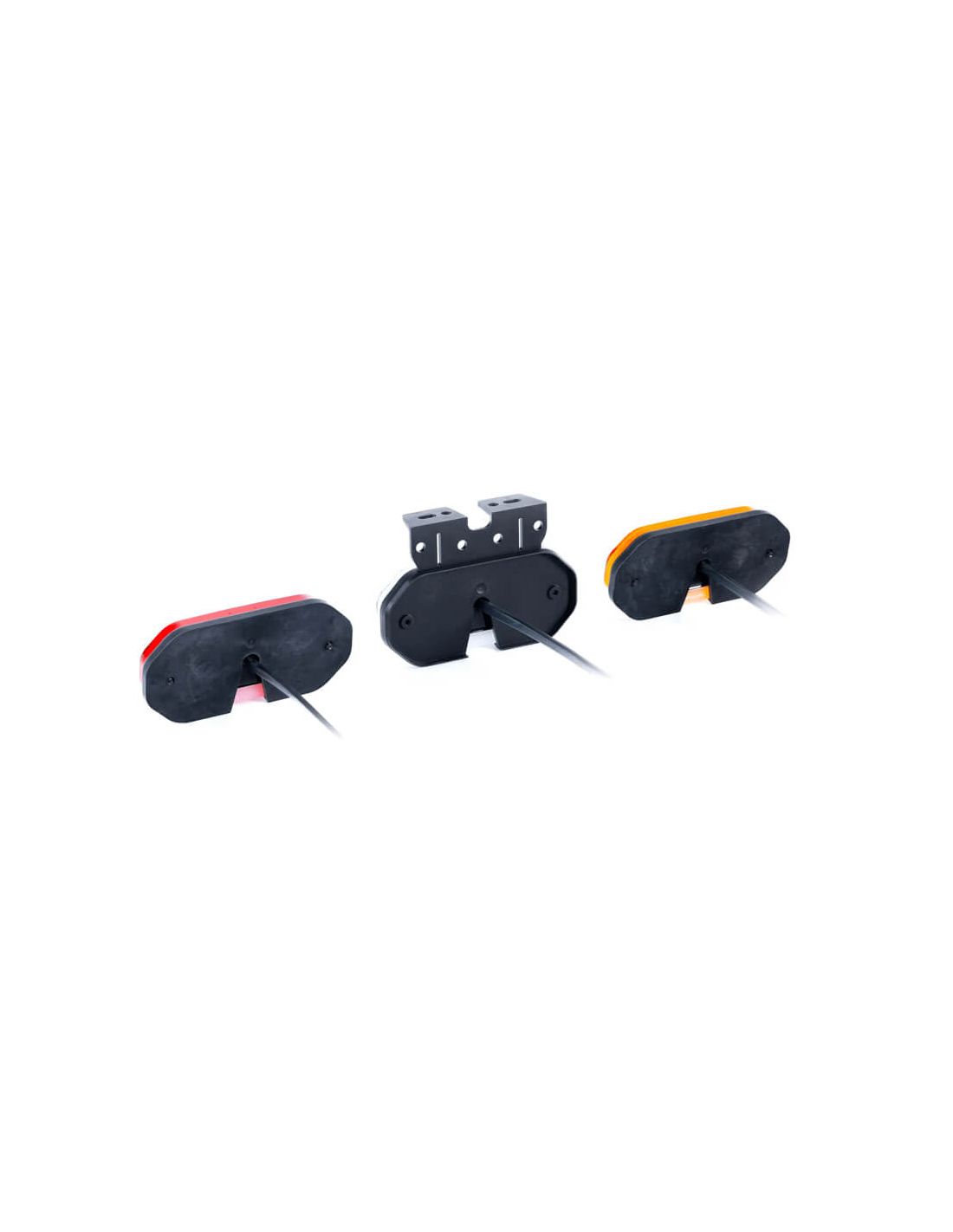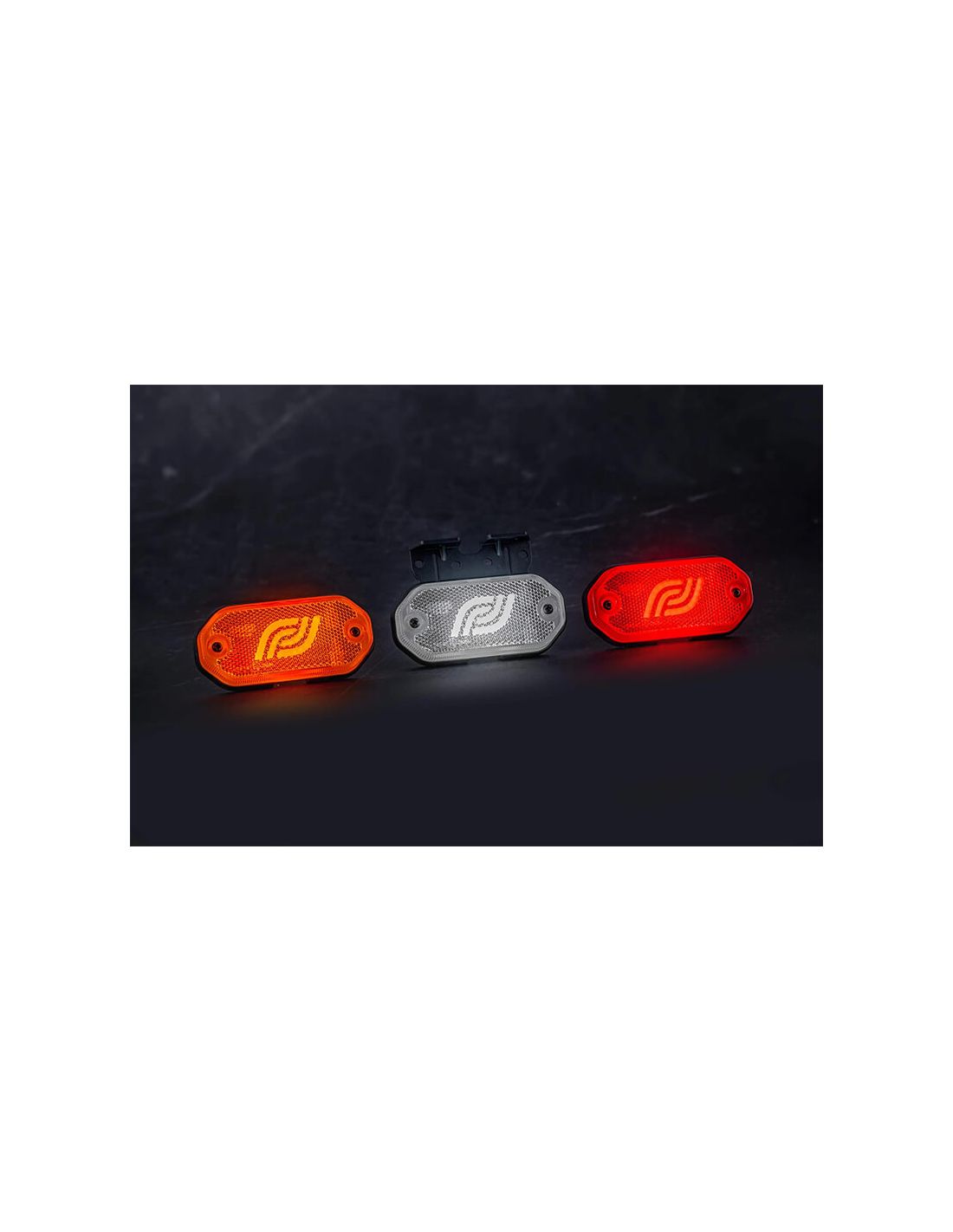 Erhältlich in drei Versionen —weiß (vorn), bernsteinfarben (seitlich) oder rot (hinten)—, funktioniert bei 12–36V, umfasst eine Flachmontagebasis, Winkelhalterung und Schrauben und ist zertifiziert R10 IA A R1 SM1.