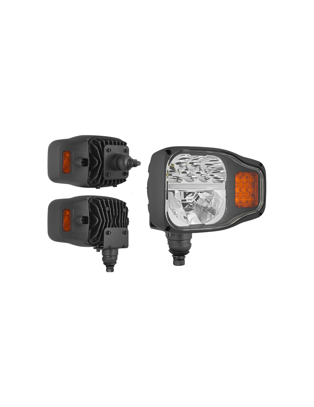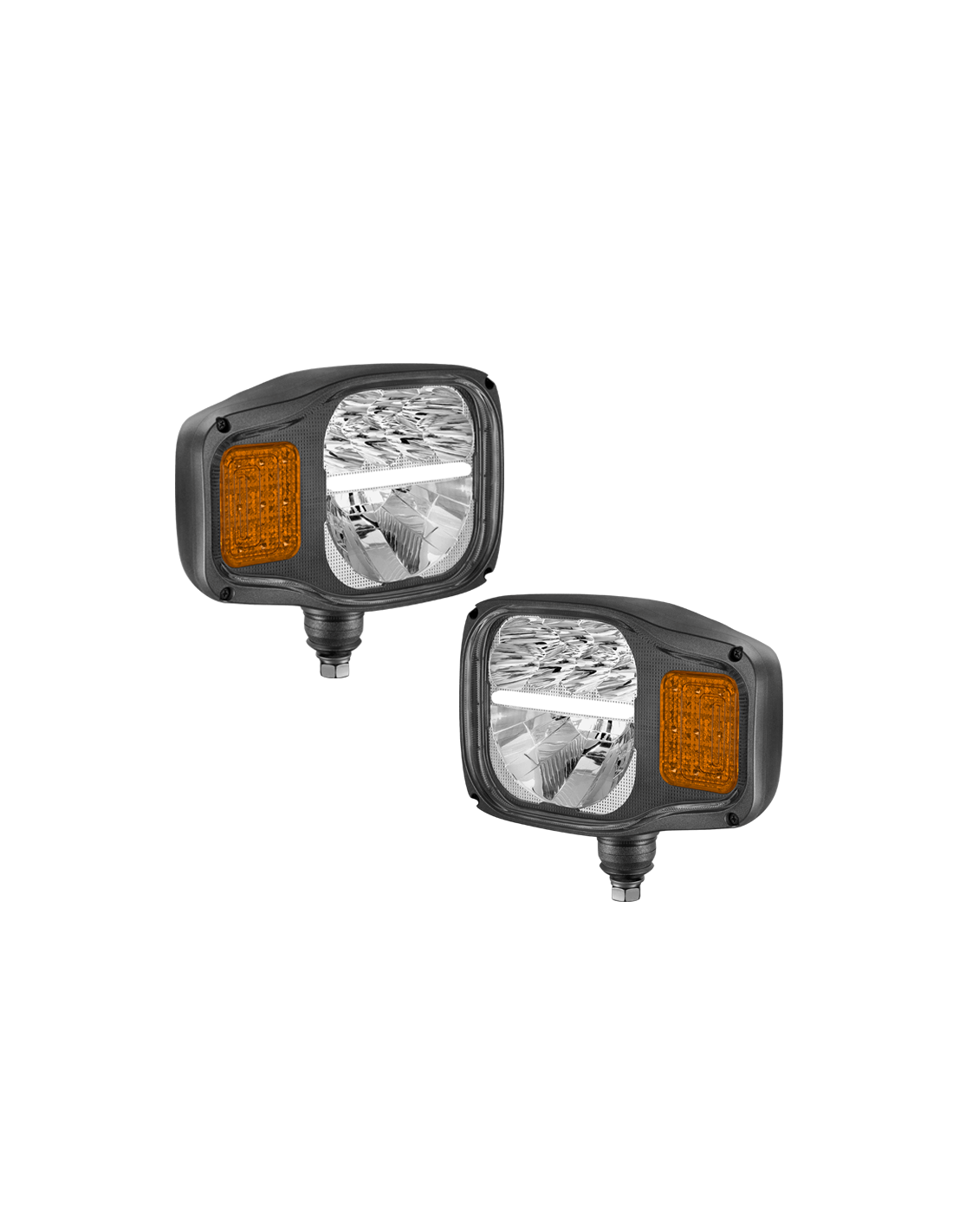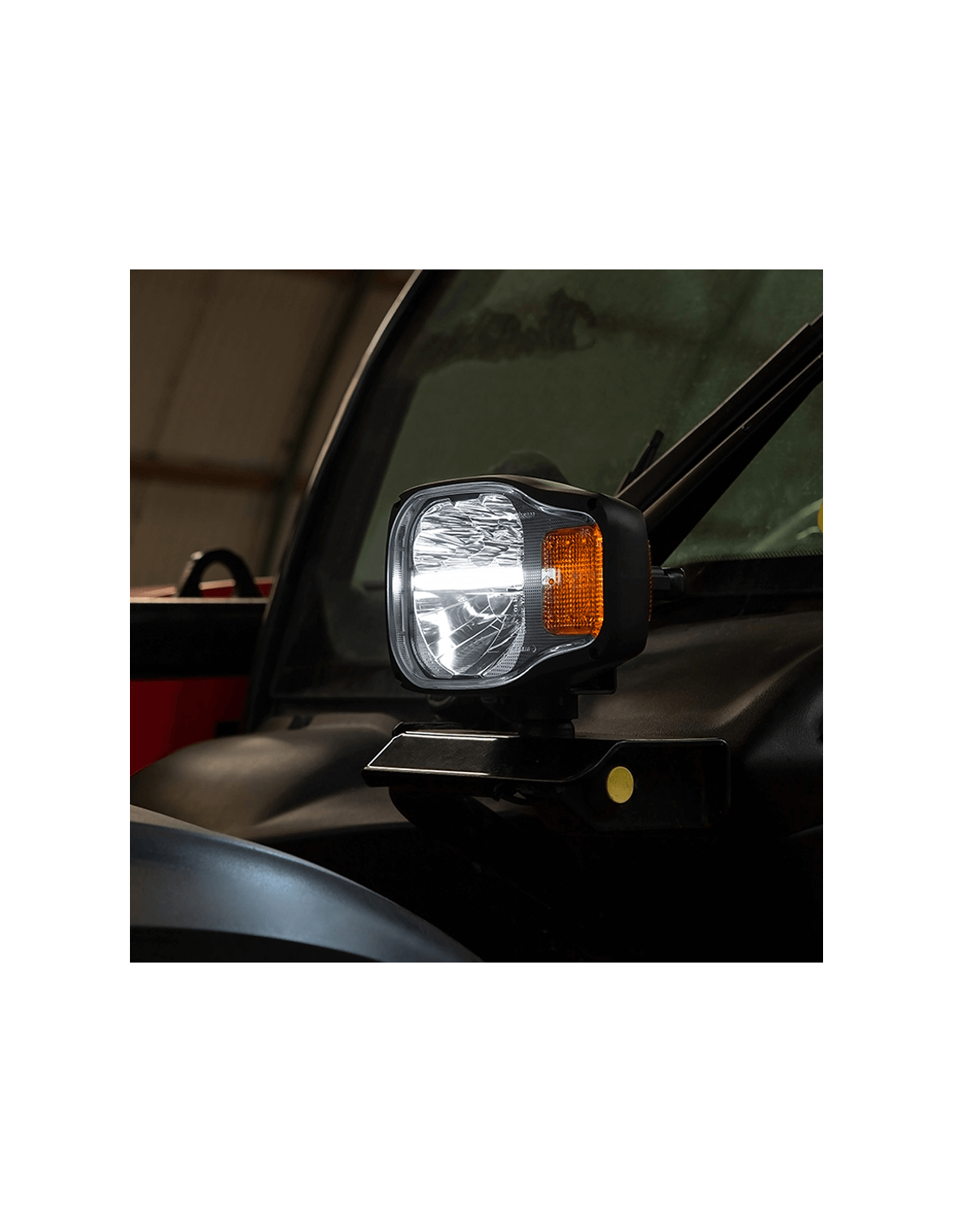 Genehmigter LED-Scheinwerfer für landwirtschaftliche und industrielle Maschinen, geeignet für Installationen von 12 bis 24 Volt und bietet 5 Funktionen: Positionslicht, Abblendlicht, Fernlicht, Blinklicht vorne und Blinklicht hinten, alle mit LED-Technologie, einschließlich Halterung und erlaubt sowohl die Installation an der Vorder- als auch Rückseite, benötigt einen 6-Pin Deutschstecker (nicht enthalten), maximale Handhabung.