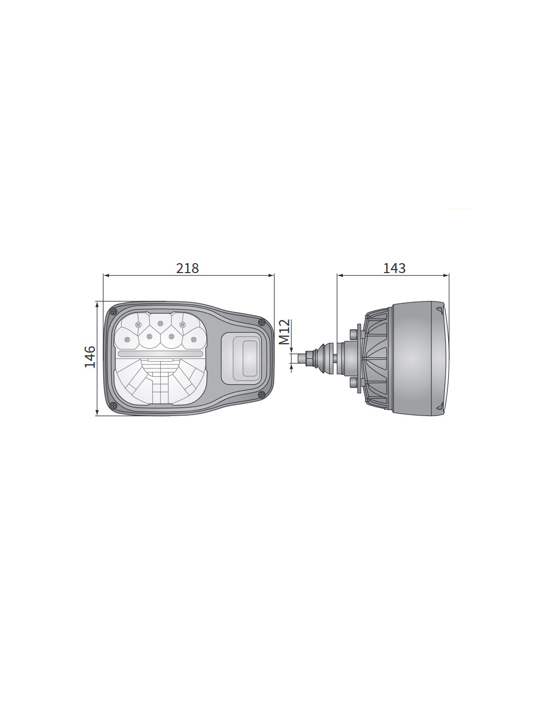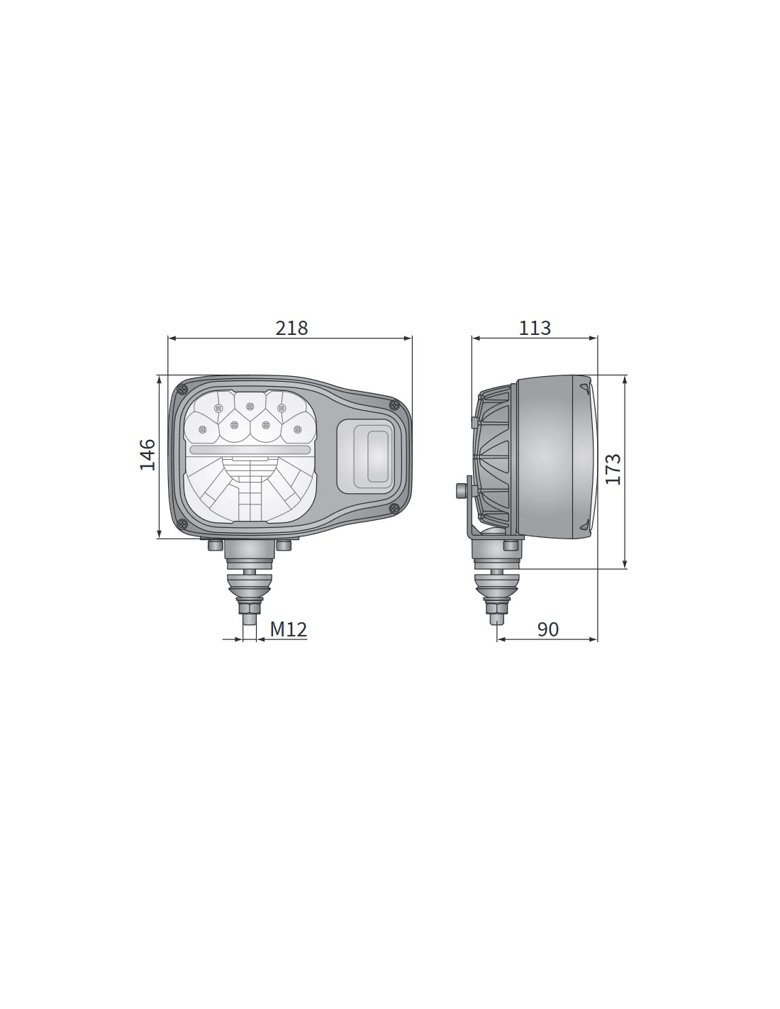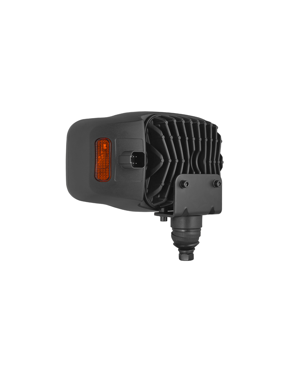 Genehmigter LED-Scheinwerfer für landwirtschaftliche und industrielle Maschinen, geeignet für Installationen von 12 bis 24 Volt und bietet 5 Funktionen: Positionslicht, Abblendlicht, Fernlicht, Blinklicht vorne und Blinklicht hinten, alle mit LED-Technologie, einschließlich Halterung und erlaubt sowohl die Installation an der Vorder- als auch Rückseite, benötigt einen 6-Pin Deutschstecker (nicht enthalten), maximale Handhabung.