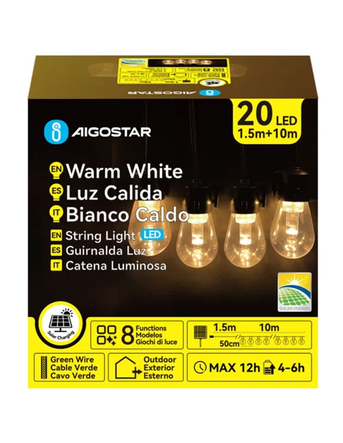 Die Solar LED Außen-Girlande 10m Blasen warmweiß IP65 Aigostar ist darauf ausgelegt, deinen Garten, deine Terrasse oder deinen Balkon in einen viel einladenderen Raum zu verwandeln, ganz ohne Steckdose. Ihre 20 warmweißen LED sind in kleinen Blasenständern aus Acrylic integriert, die das Licht streuen und einen sehr angenehmen dekorativen Effekt erzeugen, ideal für Chill-out-Umgebungen, Gartenpartys oder dezente Weihnachtsdekoration. Dank des Solarmoduls nutzt diese Solarlichter-Girlande tagsüber die Sonnenenergie und schaltet sich bei Einbruch der Dunkelheit automatisch ein, sodass du dekorative Beleuchtung mit nahezu null Verbrauch genießen kannst.