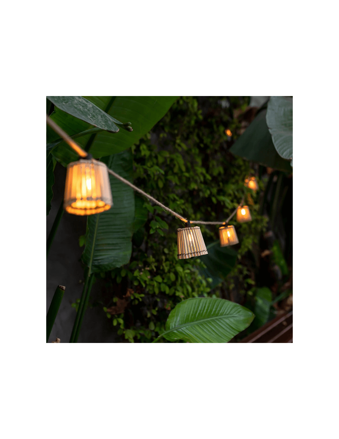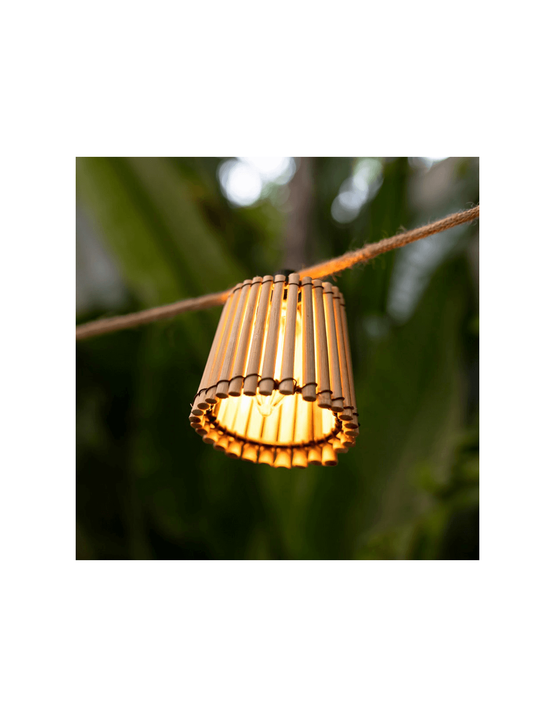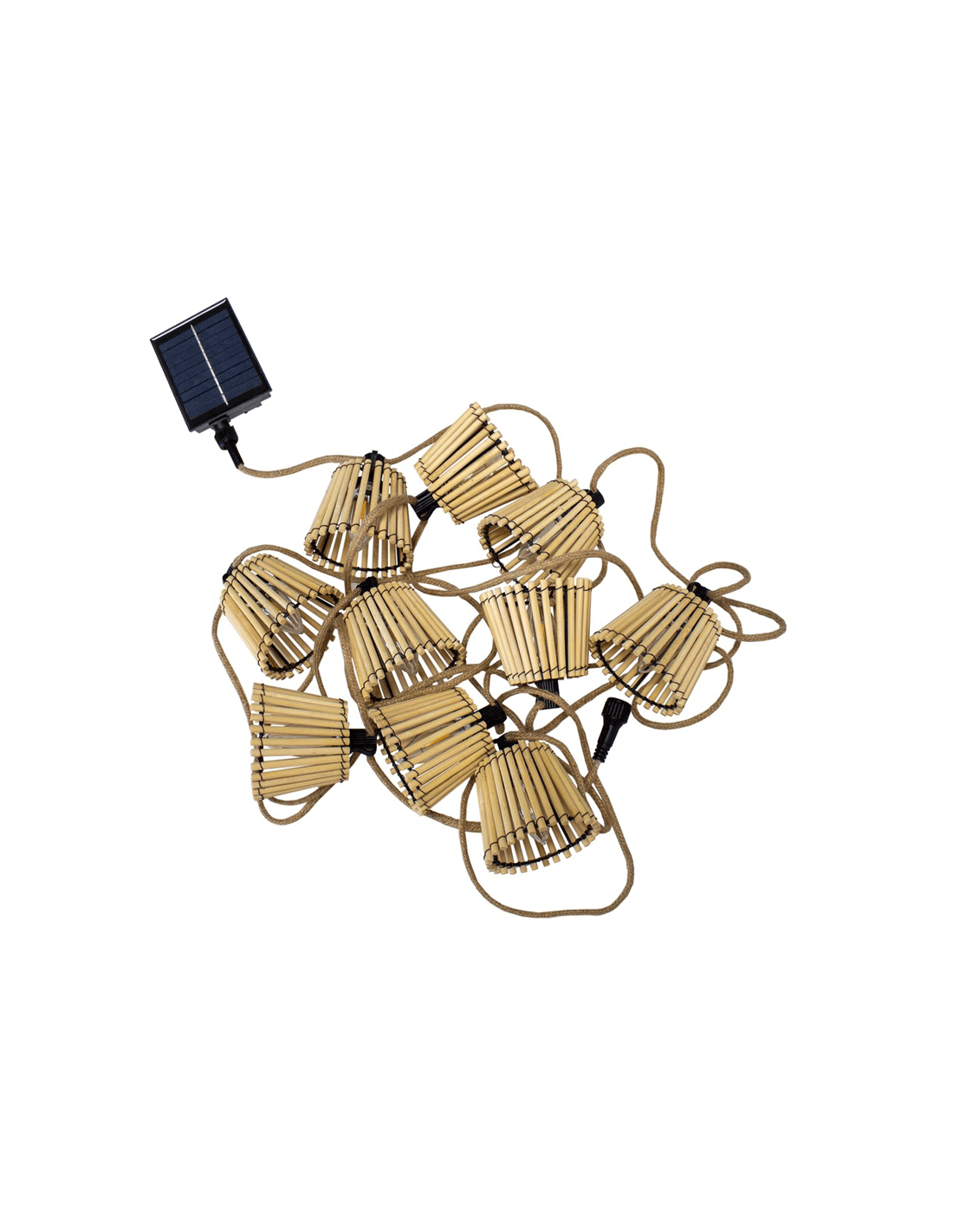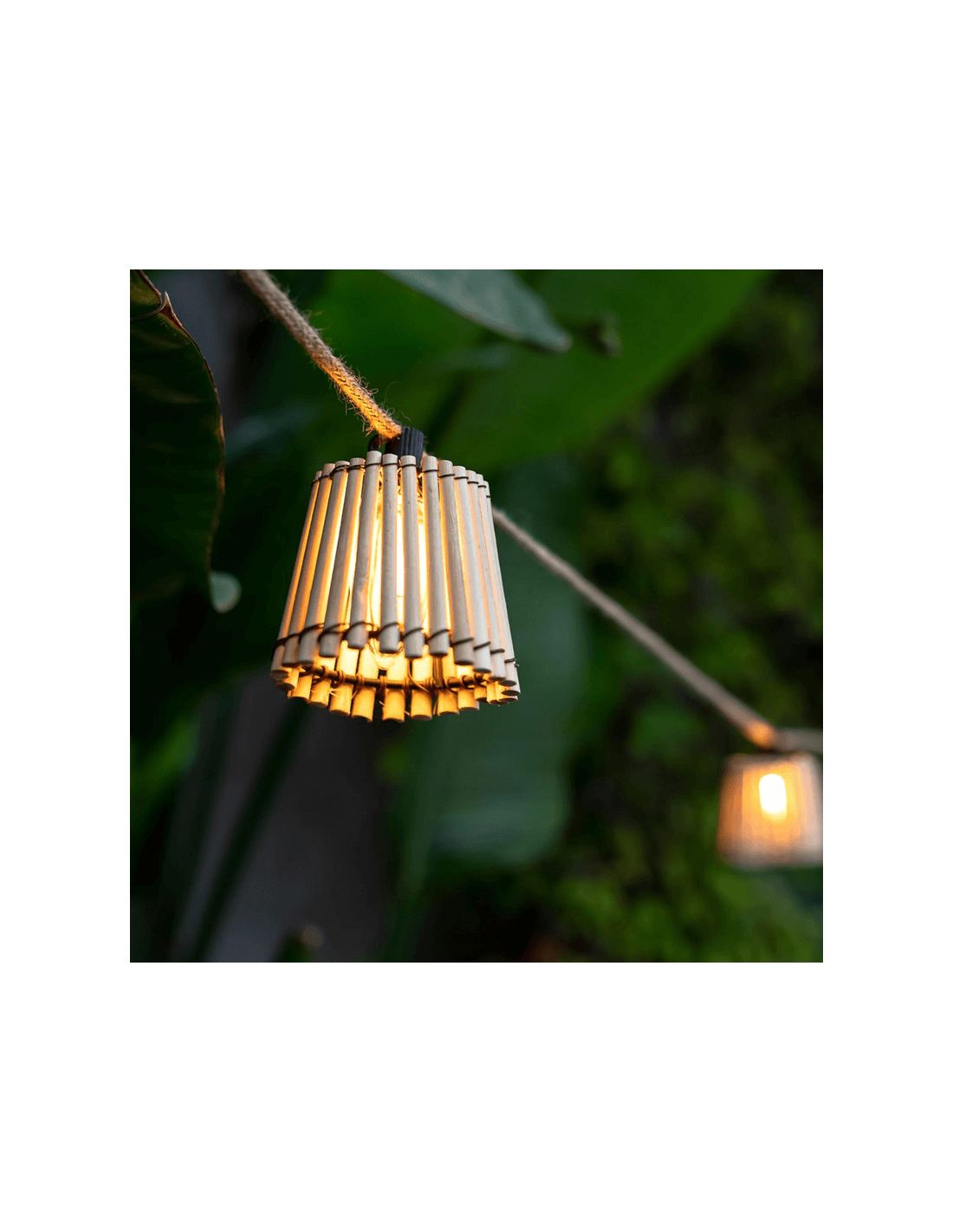 Die andere Variante ist aufladbar und funktioniert mit Solarenergie, verfügt ebenfalls über 10 Glühbirnen mit einem Lichtton im Flammeffekt von 1800k. Beide Modelle haben IP44-Schutz gegen Spritzwasser und sind somit für die Nutzung im Außenbereich geeignet. Genieße eine warme und entspannende Beleuchtung, die das Feuer simuliert, und das Gehäuse ist aus geflochtenem Bambus. Jedes Licht verfügt über einen Haken an der Oberseite, um sie leicht aufzuhängen.
