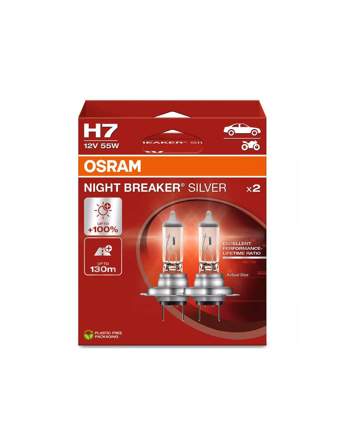Halogenlampe OSRAM NIGHT BREAKER SILVER H7 12V 55W. Bis zu 100% mehr Licht und ein Strahl von 130 Metern bei höherer Haltbarkeit. Ideal für sicheres und leistungsstarkes Fahren.