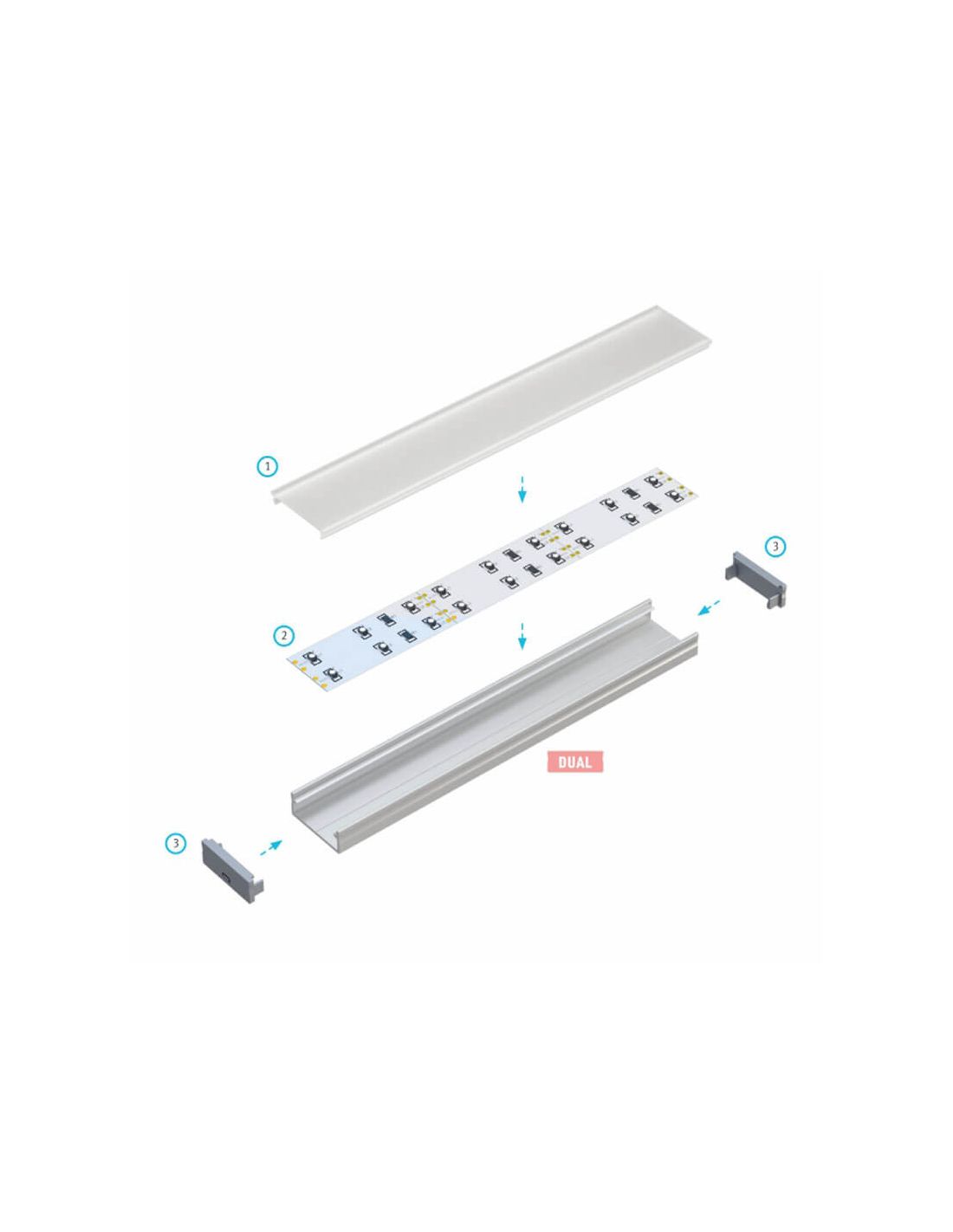Endkappe zur Installation an dem Dual-Profil in grauer Ausführung, dieses neue Modells der Kappe ist 2 in 1, ermöglicht das Entfernen einer Kappe, um ein Kabel bei Bedarf durchzuleiten