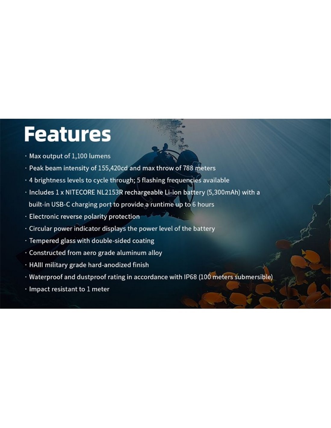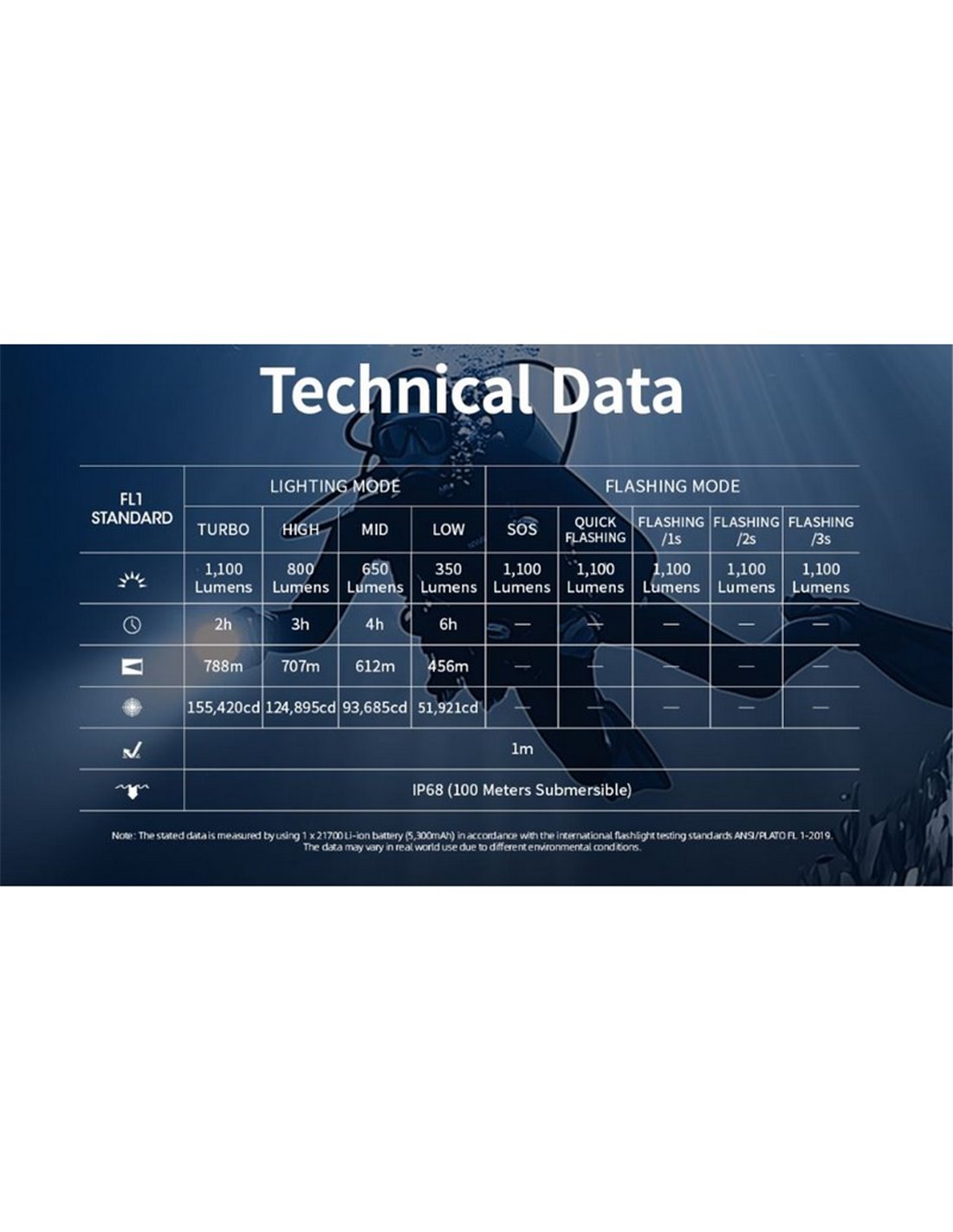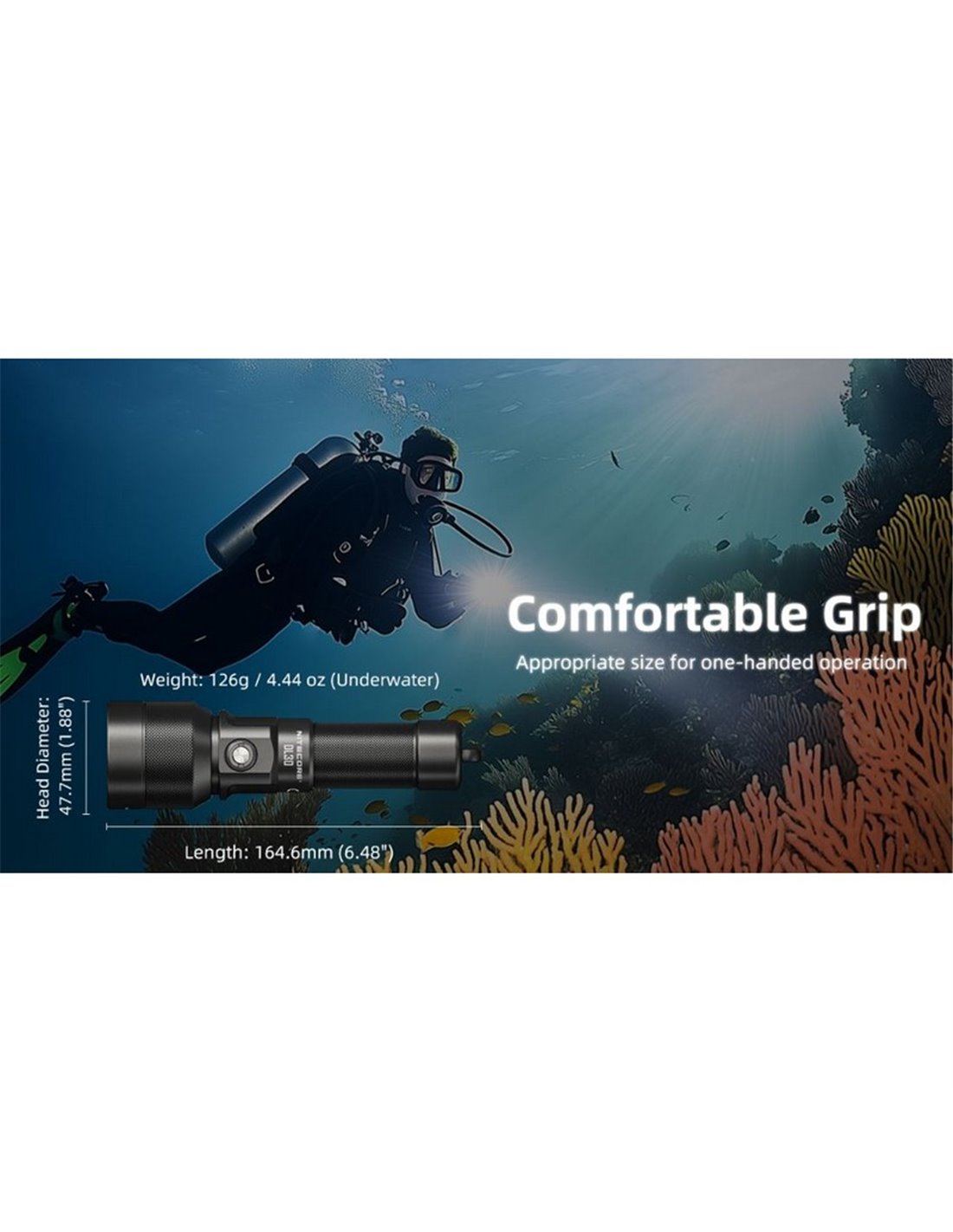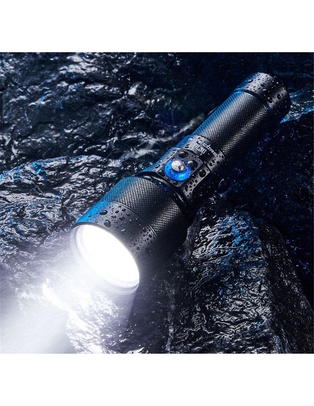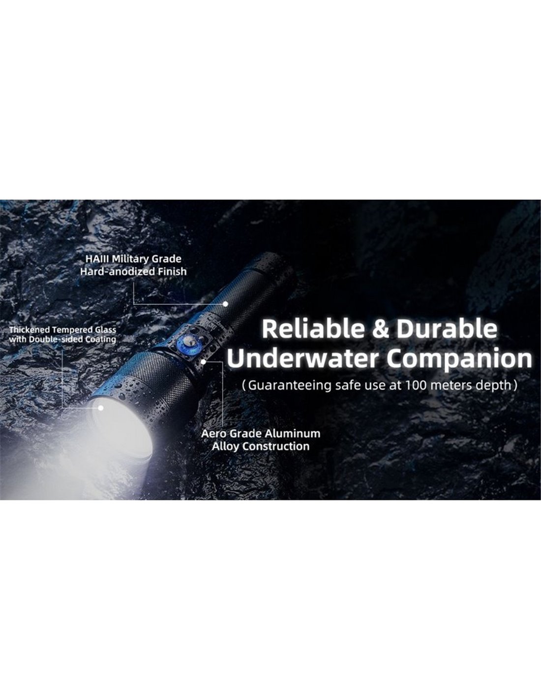 - Leistung und Reichweite: Erzeugt einen intensiven Lichtstrahl mit 1.100 Lumen und einer maximalen Reichweite von 788 Metern, ideal für Unterwassererkundungen und große Räume.