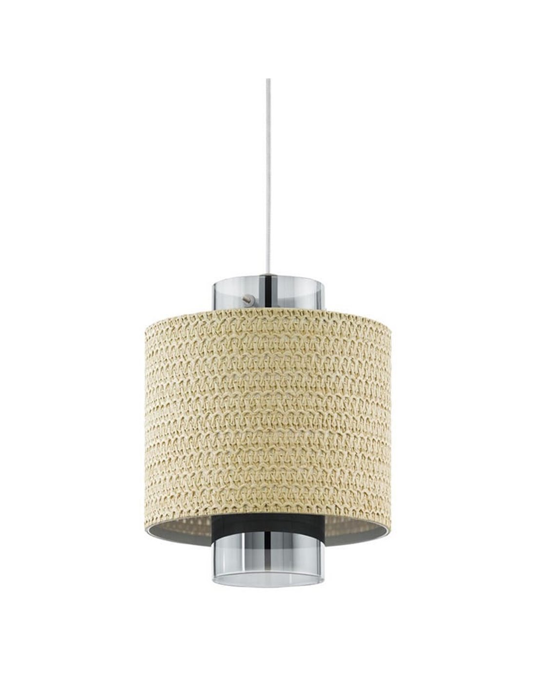 Hängeleuchte MEDIOUNA von Eglo, mit einem Schirm aus Seegrasgewebe in natürlicher Farbe und einem inneren Körper aus vergoldetem Kristall. Kompatibel mit E27-Glühbirne (nicht enthalten). Ideal für Vintage- und Bohemia-Stile.