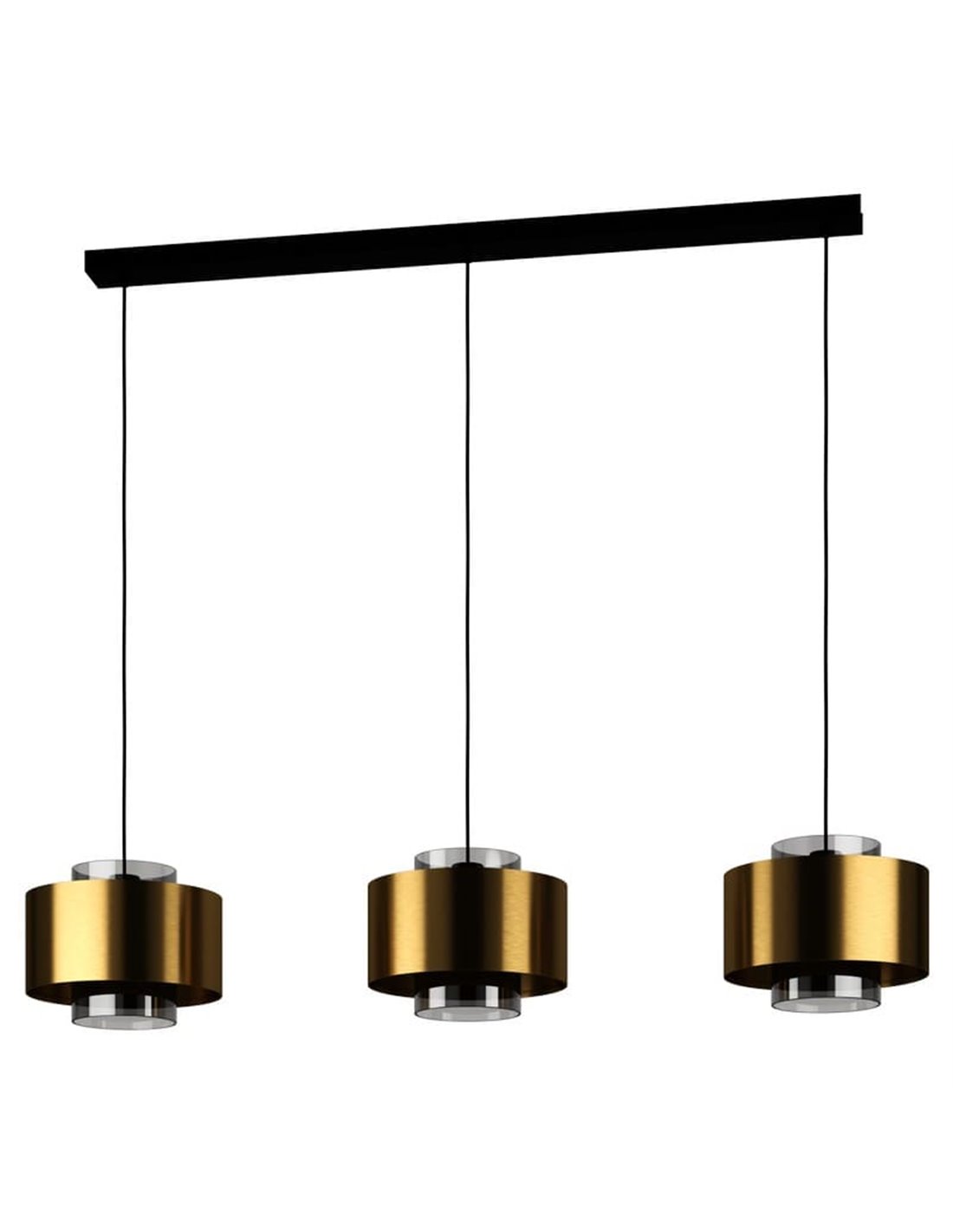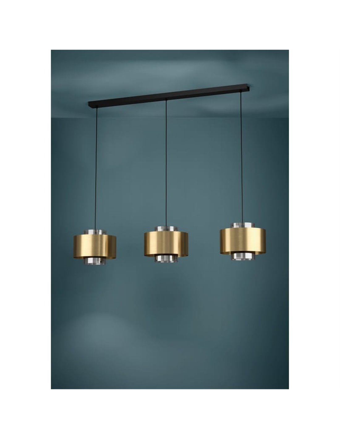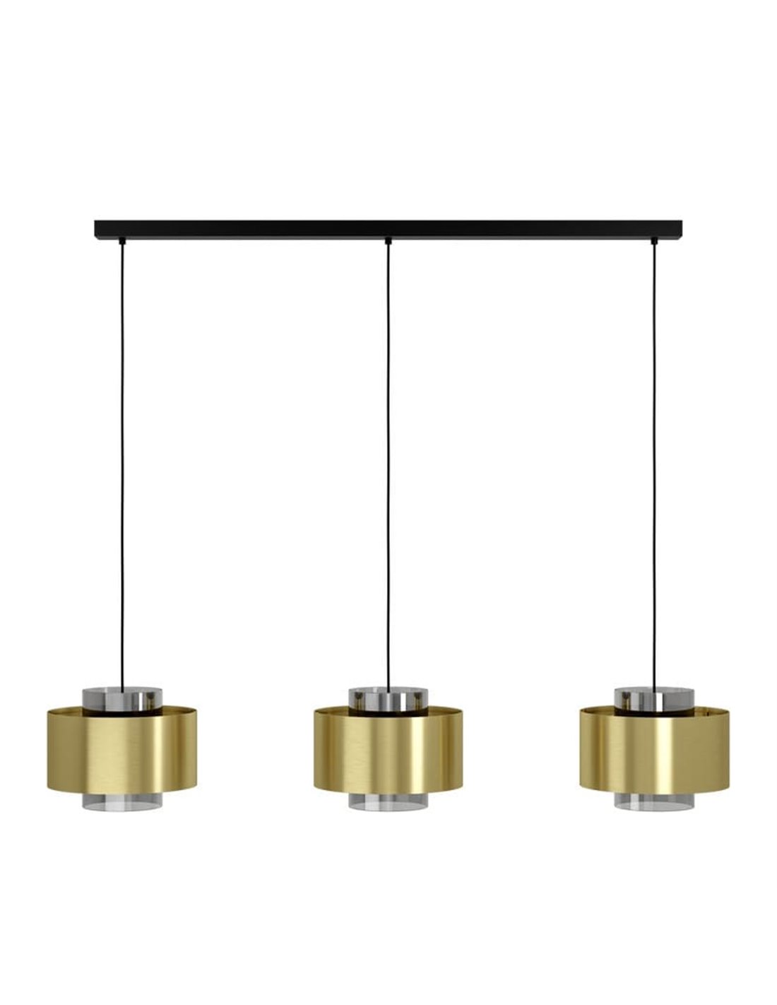 Die Hängelampe 3 Lichter DUGLIA von EGLO zeichnet sich durch ihre Konstruktion aus Metall und Glas mit einem Finish in Schwarz/Gold und transparenten Schirmen aus. Ein Design, das Stil und Funktionalität in Räumen wie Wohnzimmer, Esszimmer oder Schlafzimmer bietet. Mit einer E27-Fassung und Schutzart IP20 ist sie eine vielseitige und langlebige Option, die Ästhetik und Praktikabilität vereint.