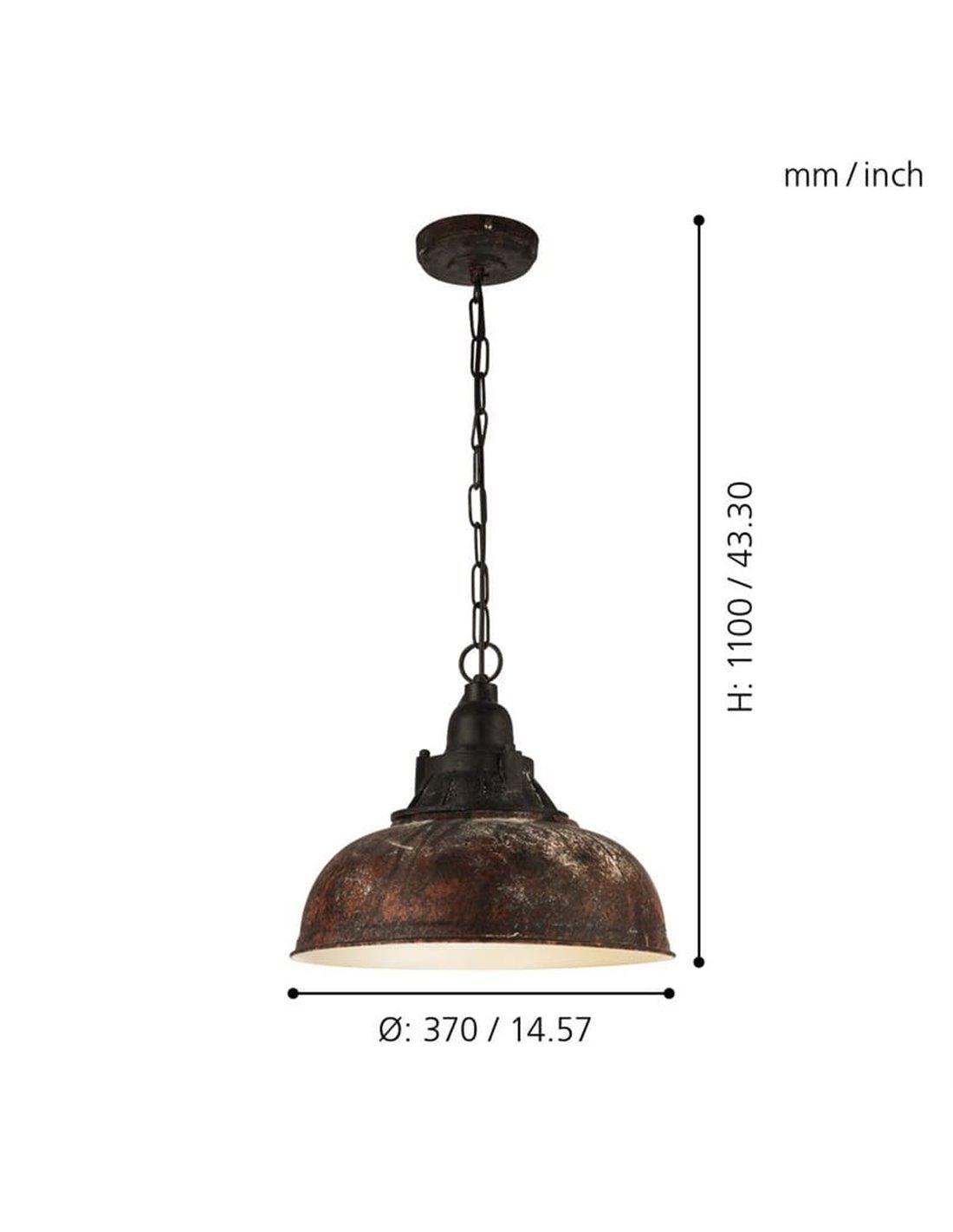 Die Hängelampe GRANTHAM 1 bringt nicht nur Licht, sondern auch Charakter und Stil in Ihren Raum. Ihr Design aus antikem Kaffeesstahl und die Stahlkonstruktion machen sie zu einem optisch beeindruckenden Stück, ideal für diejenigen, die eine einzigartige und authentische Einrichtung suchen. Installieren Sie sie im Wohnzimmer, in der Küche oder in einem gewerblichen Raum und genießen Sie eine Beleuchtung, die die Atmosphäre aufwertet. Warten Sie nicht länger und verleihen Sie Ihrer Einrichtung einen industriellen Touch! Kaufen Sie jetzt diese Lampe von EGLO bei LeonLeds und verwandeln Sie Ihren Raum.- Höhe
