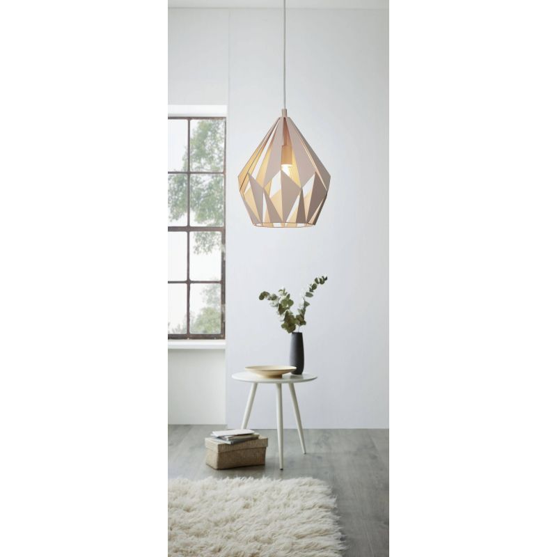 Hängelampe aus pastellpfirsichfarbenem Stahl von der Kollektion Carlton 1 des Herstellers Eglo Beleuchtung. Elegante Lampe mit einem abstrakten rosa Schirm, der aus unregelmäßigen Dreiecken besteht und die Sicht auf eine Lampe mit E27-Fassung (nicht enthalten) freigibt. Wir empfehlen die Verwendung einer LED-Gebläselampe, um ihren Vintage- und Retro-Stil zu betonen. Bevorzugt in einem warmen Ton wie 3000K, um den gewünschten Vintage- oder industriellen Effekt zu verstärken. Die empfohlene Leistung liegt bei 10 bis 17 W, je nach den Abmessungen des Raumes, den wir beleuchten möchten.