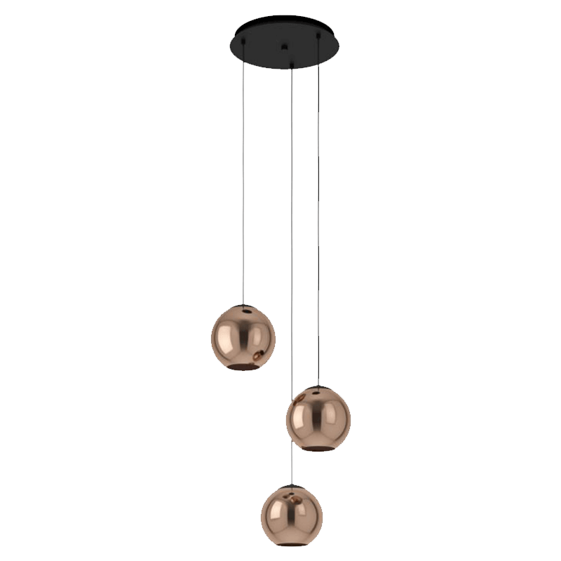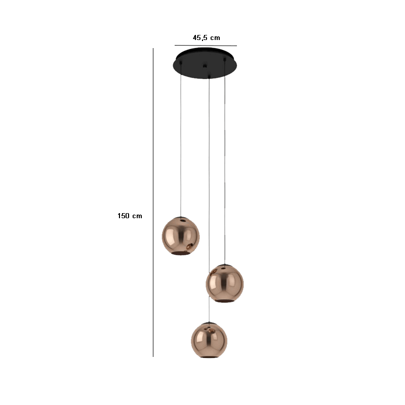 Die Kuppellampe Córdoba besteht aus drei Lampenschirmen in Form von kugelförmigen dampfvergoldeten Gläsern, die an hochwertigen schwarzen Textilkabeln von einem verlängerten Metallsockel in derselben Farbe gehalten werden. Ihr Maß beträgt eine Höhe von 150 cm, einen Durchmesser von 45,5 cm und ein Gewicht von 2,63 kg.