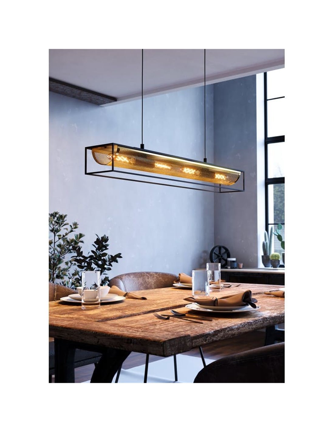 Hängelampe NOHALES von Eglo, mit langem schwarzen Metallrahmen und vier sichtbaren Glühbirnen. Kompatibel mit E27-Glühbirnen (nicht enthalten). Ideal, um einen modernen und industriellen Akzent in Esszimmer und Wohnzimmer zu setzen.
