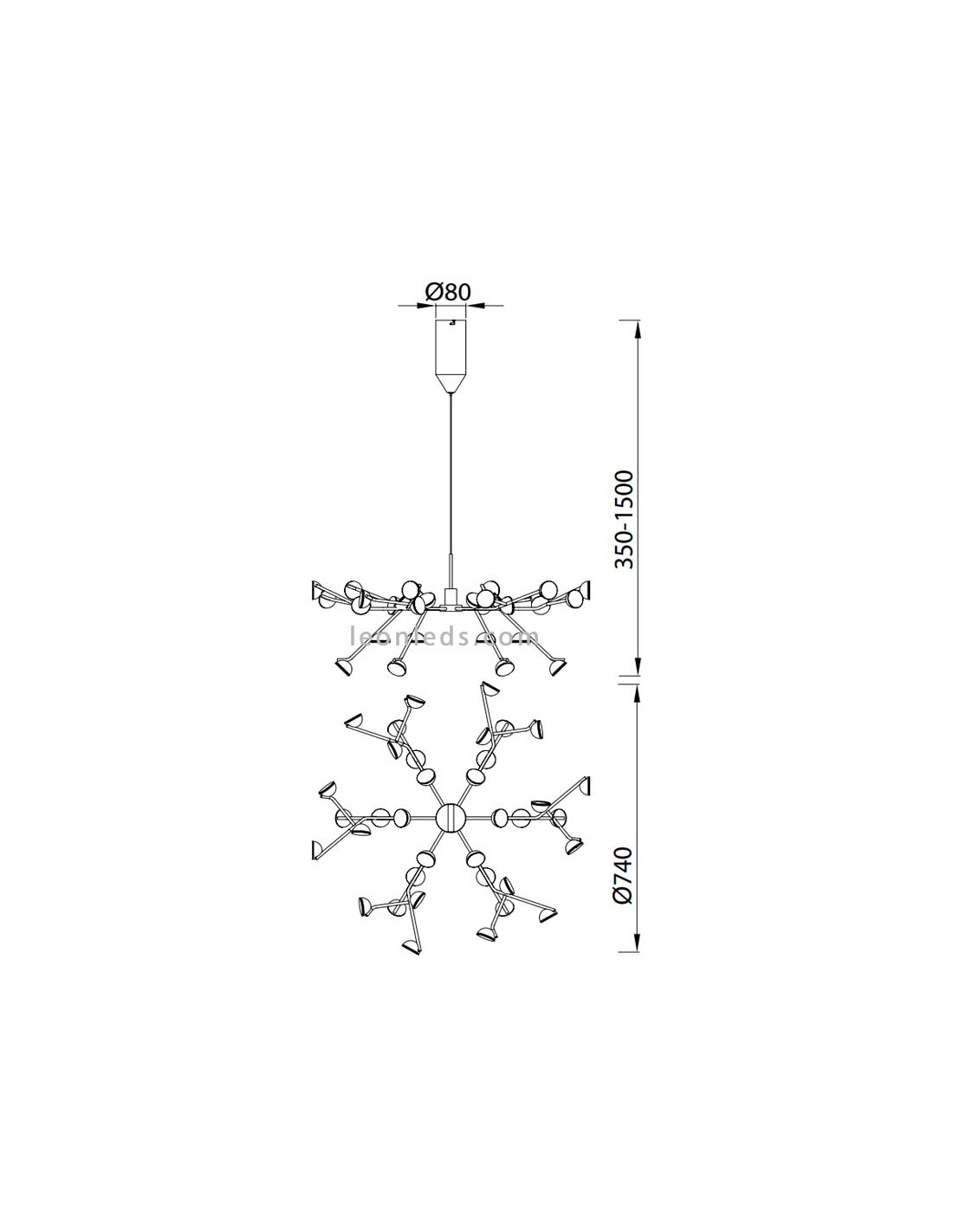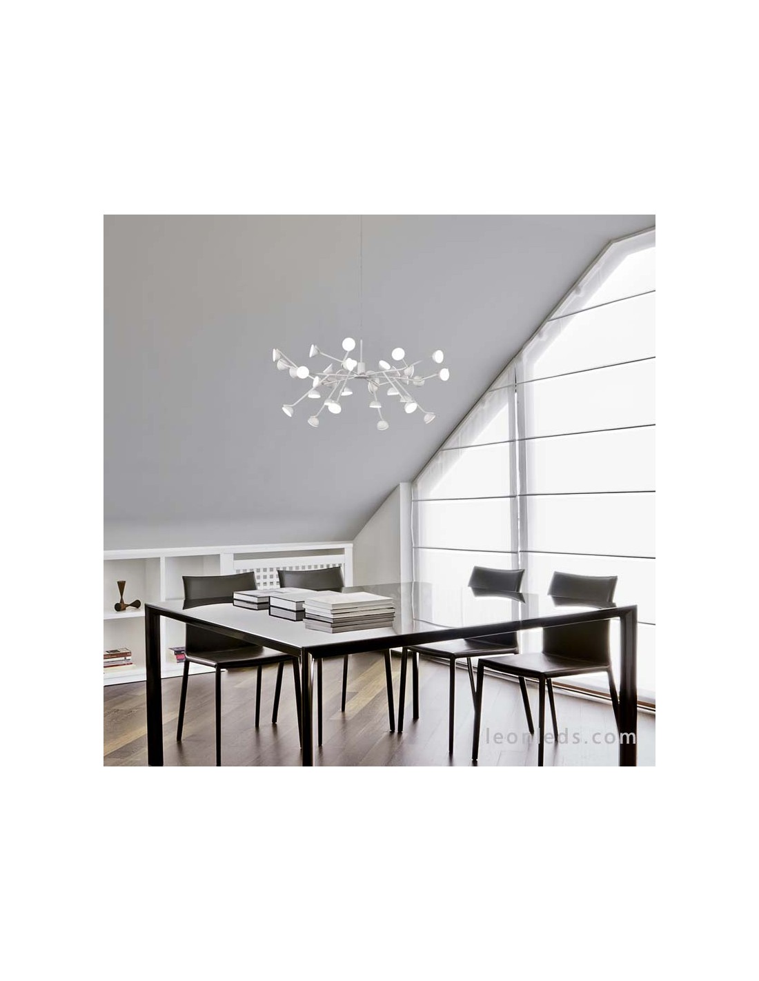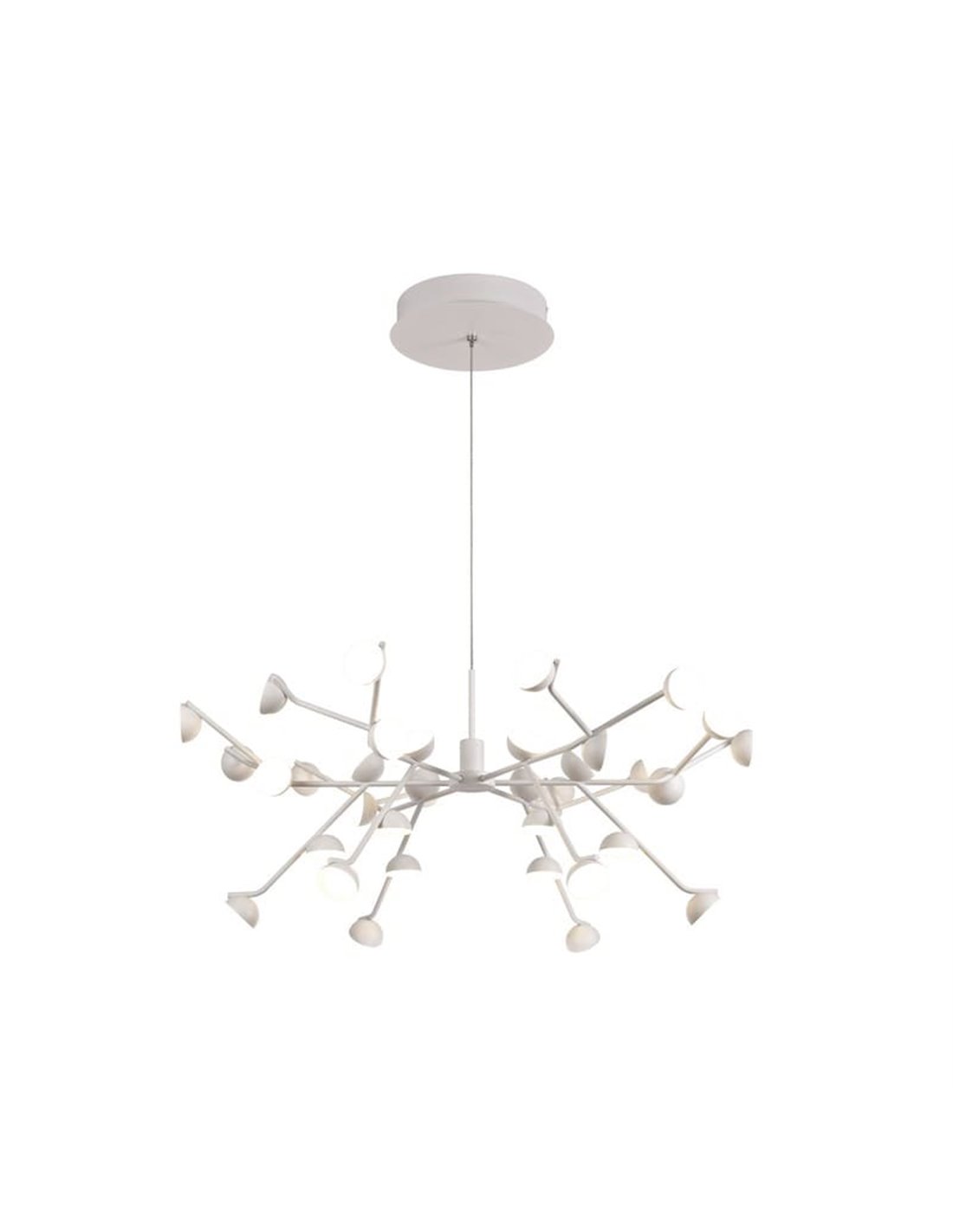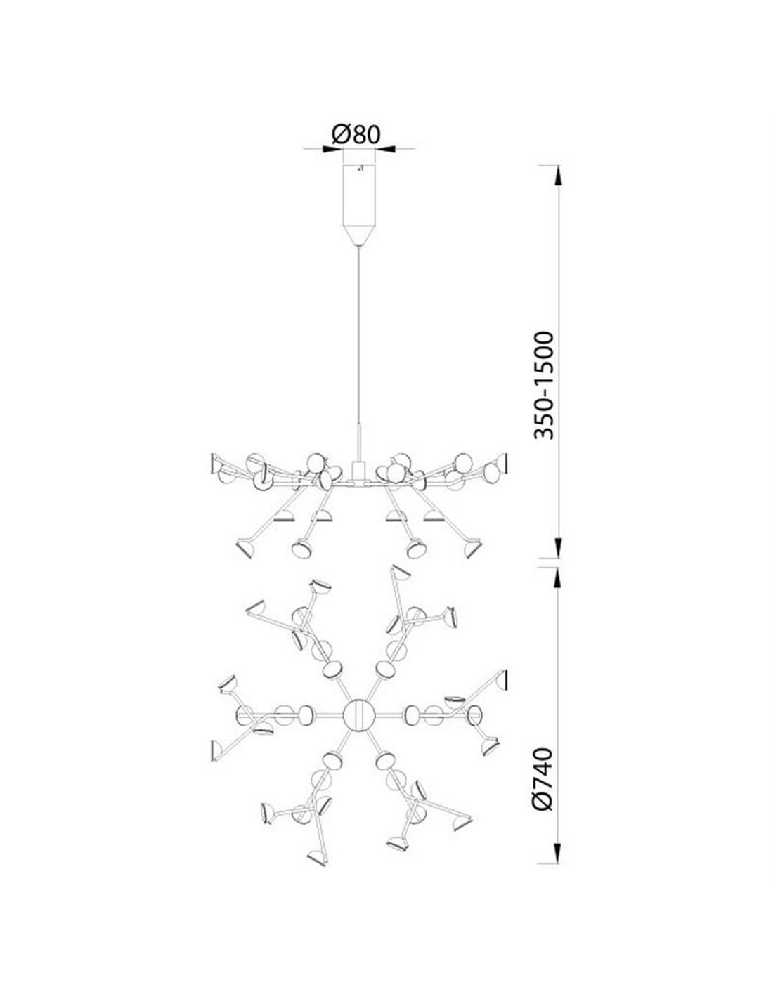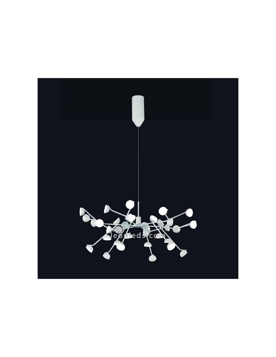 Die runde Deckenlampe der ADN-Serie von Mantra Beleuchtung ist ein einzigartiges und originales Produkt im Vergleich zu den bisher gesehenen Lampen. Die Lampe hat einen Durchmesser von 74CM mit einer zentralen Halterung, die durch ein Kabel gehalten wird, von dem 6 Äste mit jeweils 6 Lichtpunkten abzweigen, die eine Struktur ähnlich der DNA bilden.